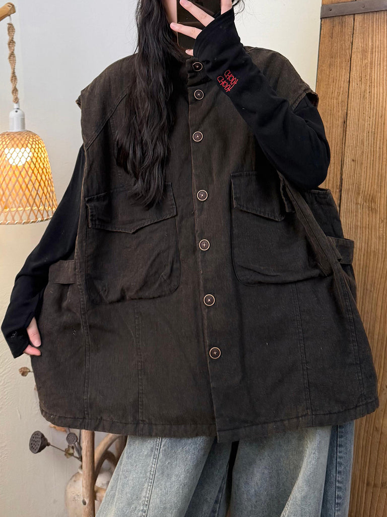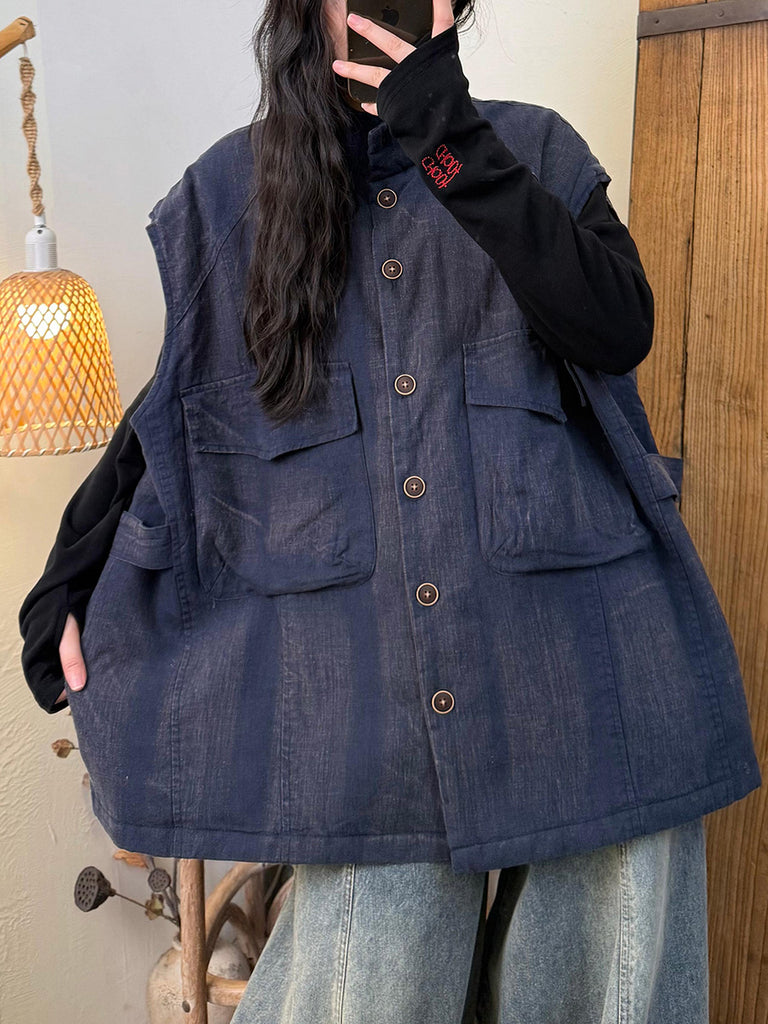 Ženski jesenski podstavljeni laneni prsluk s ovratnikom u čistoj boji