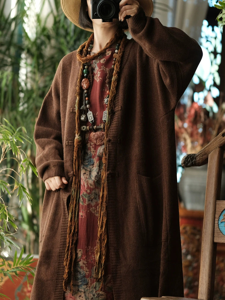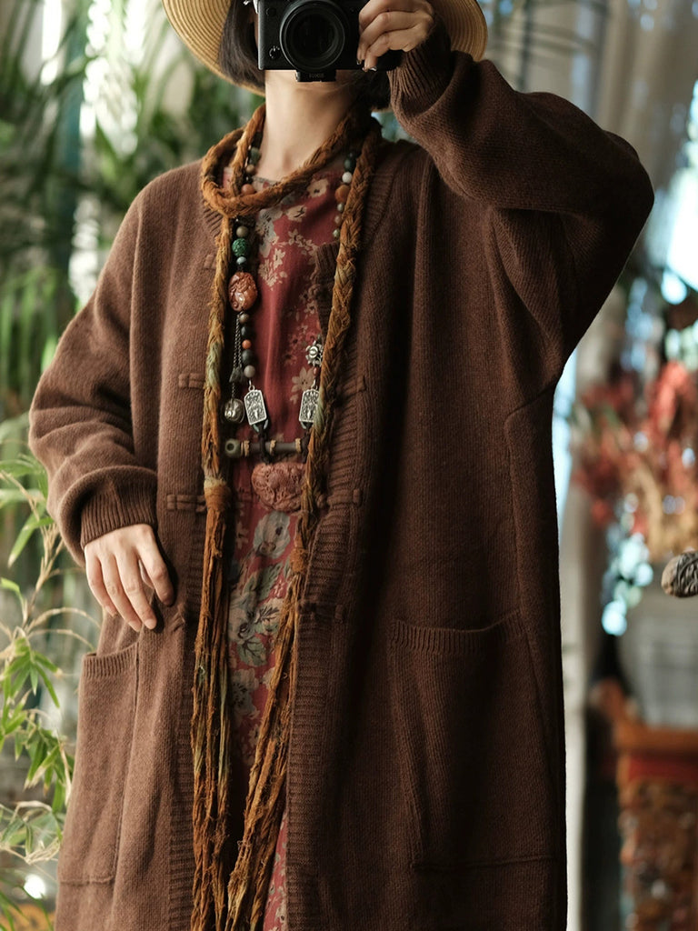 Ženski vintage zimski pleteni kaput od vune s O-izrezom u čistoj boji