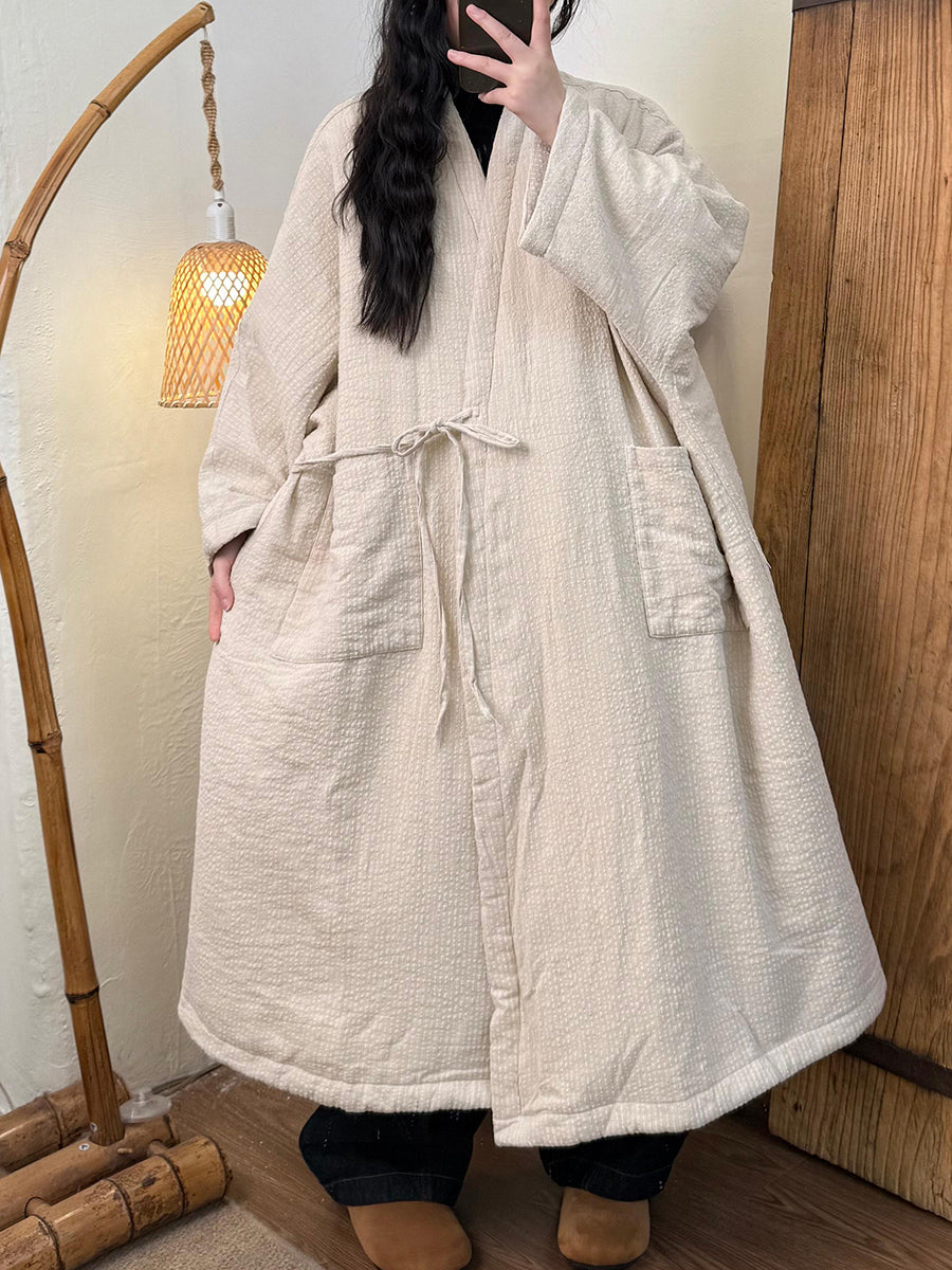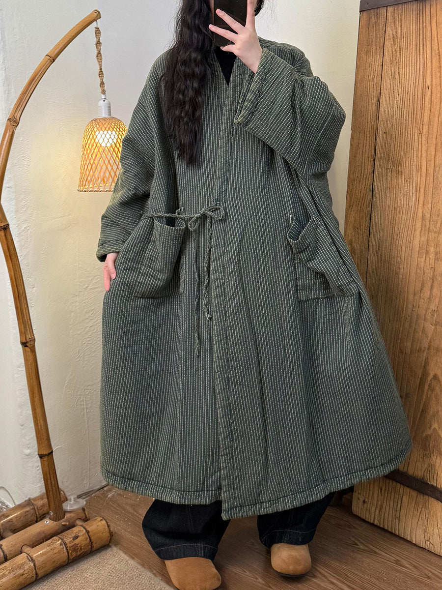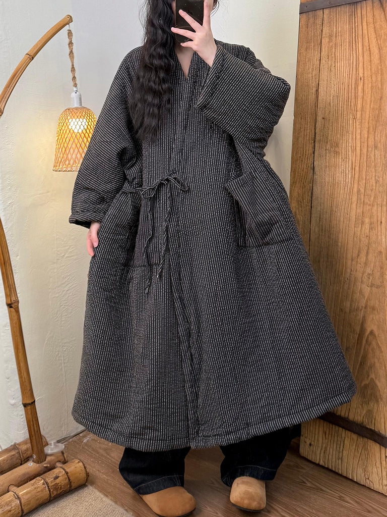 Ženski zimski vintage prugasti podstavljeni kaput s V-izrezom