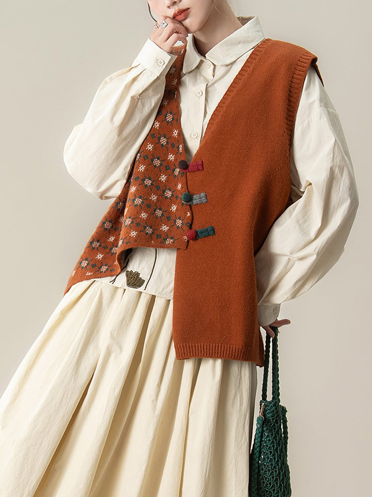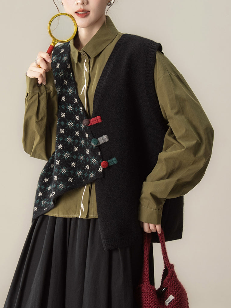 Ženski jesenski cvjetni pleteni prsluk s nepravilnim V-izrezom