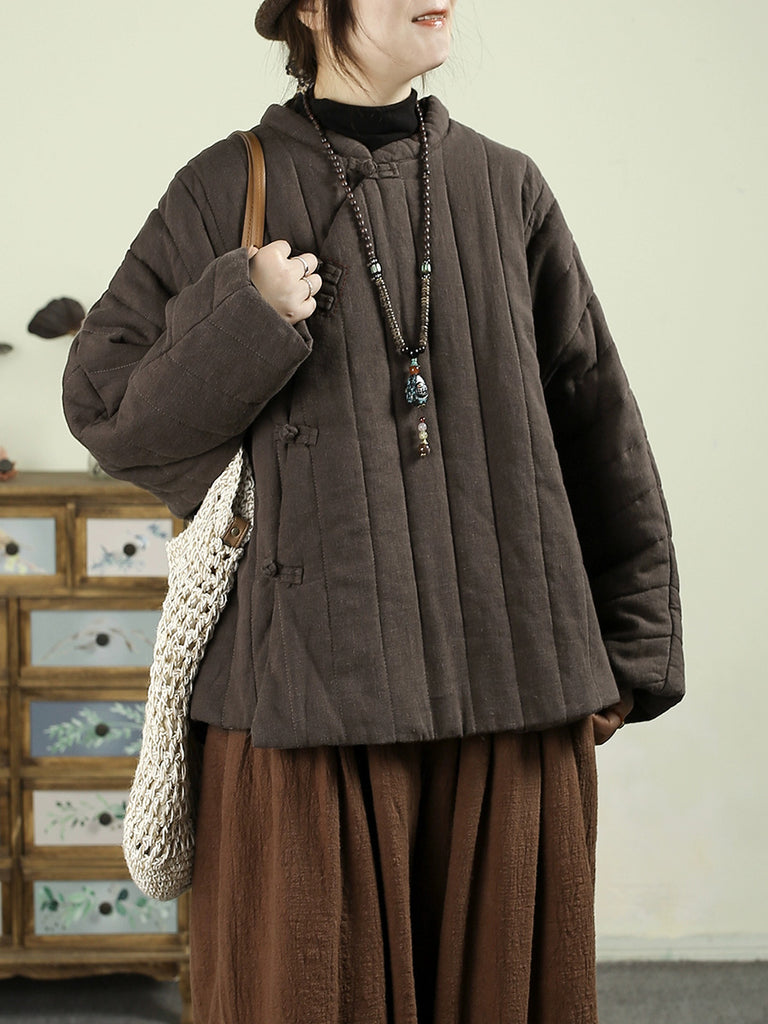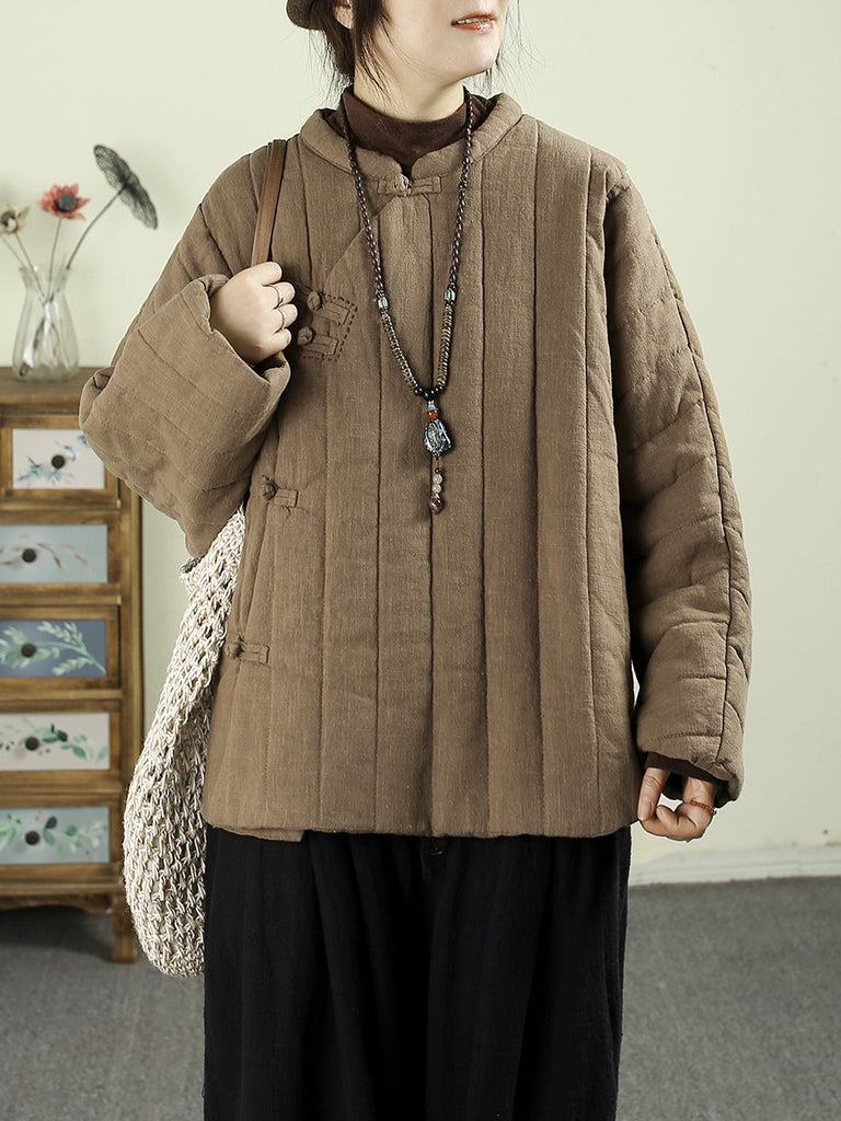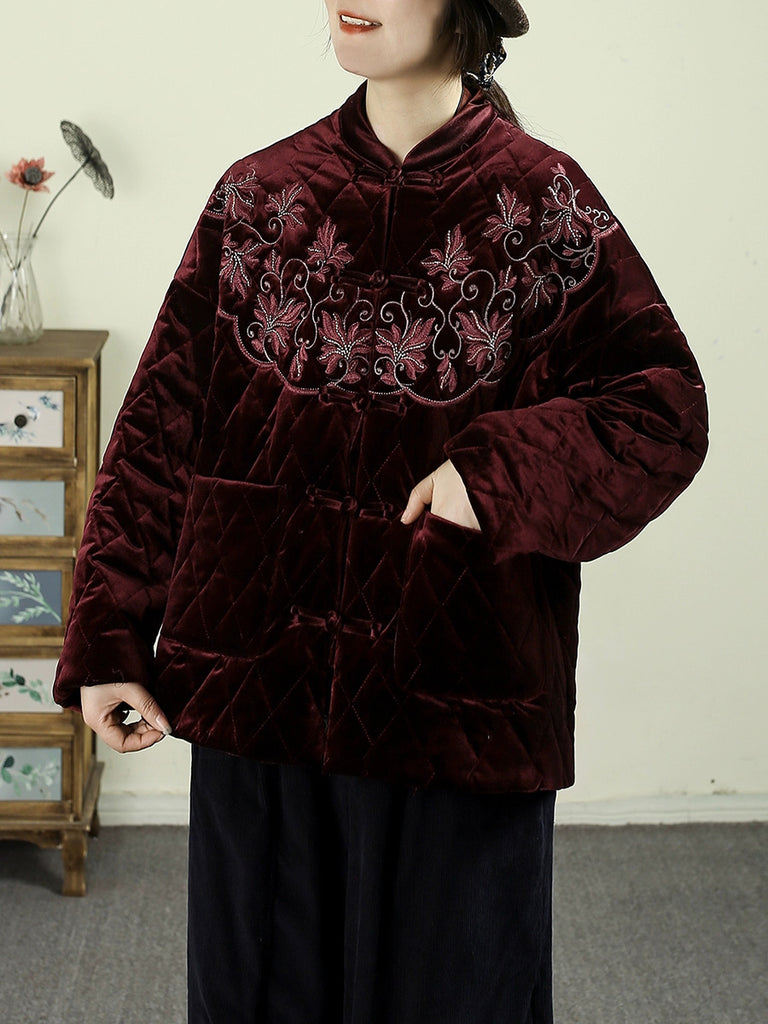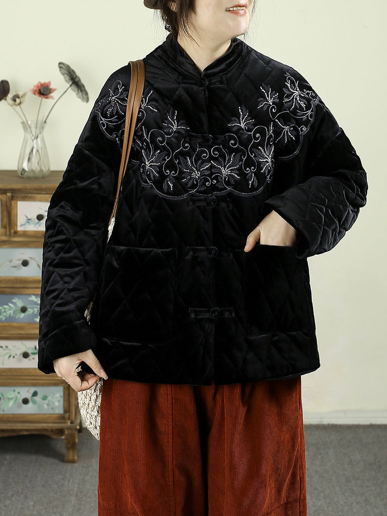 Ženska zimska vintage jakna s vezom i podstavljenim stojećim ovratnikom