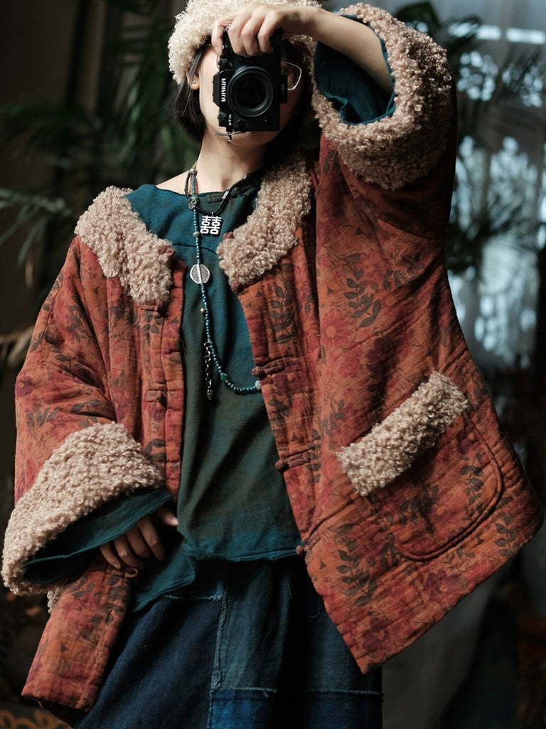 Ženski vintage zimski kaput od cvjetnog flisa s O-izrezom