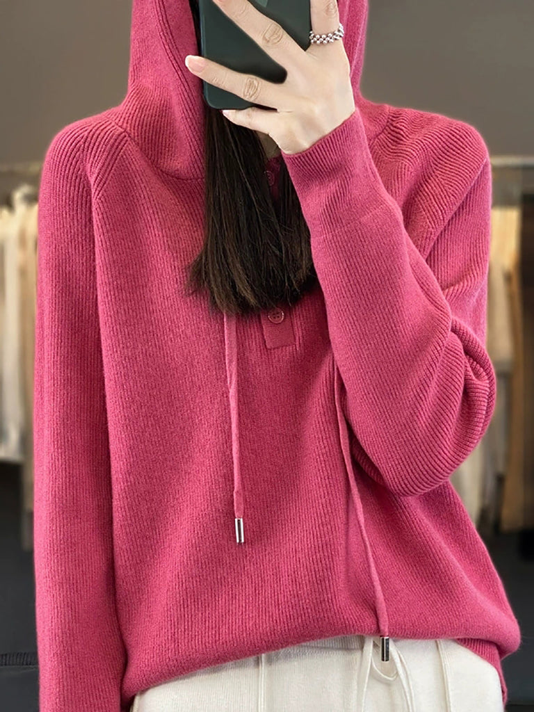 Ženski jesenski ležerni pleteni pulover s kapuljačom u čistoj boji