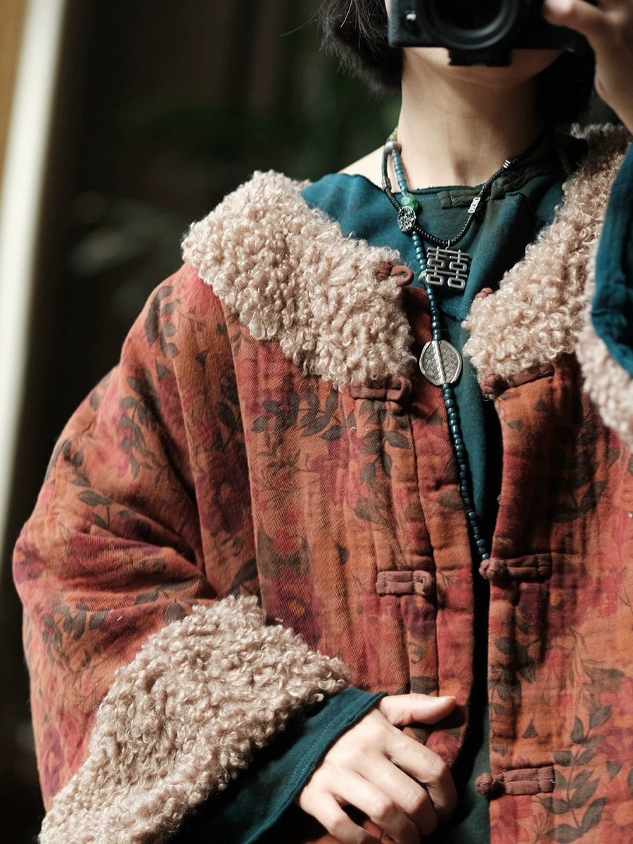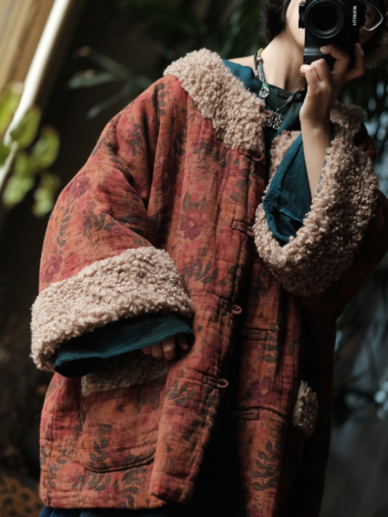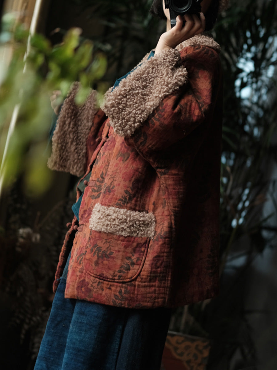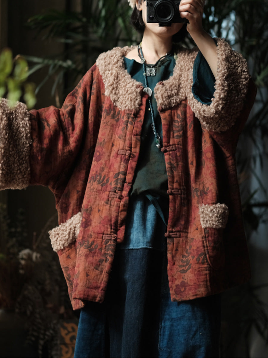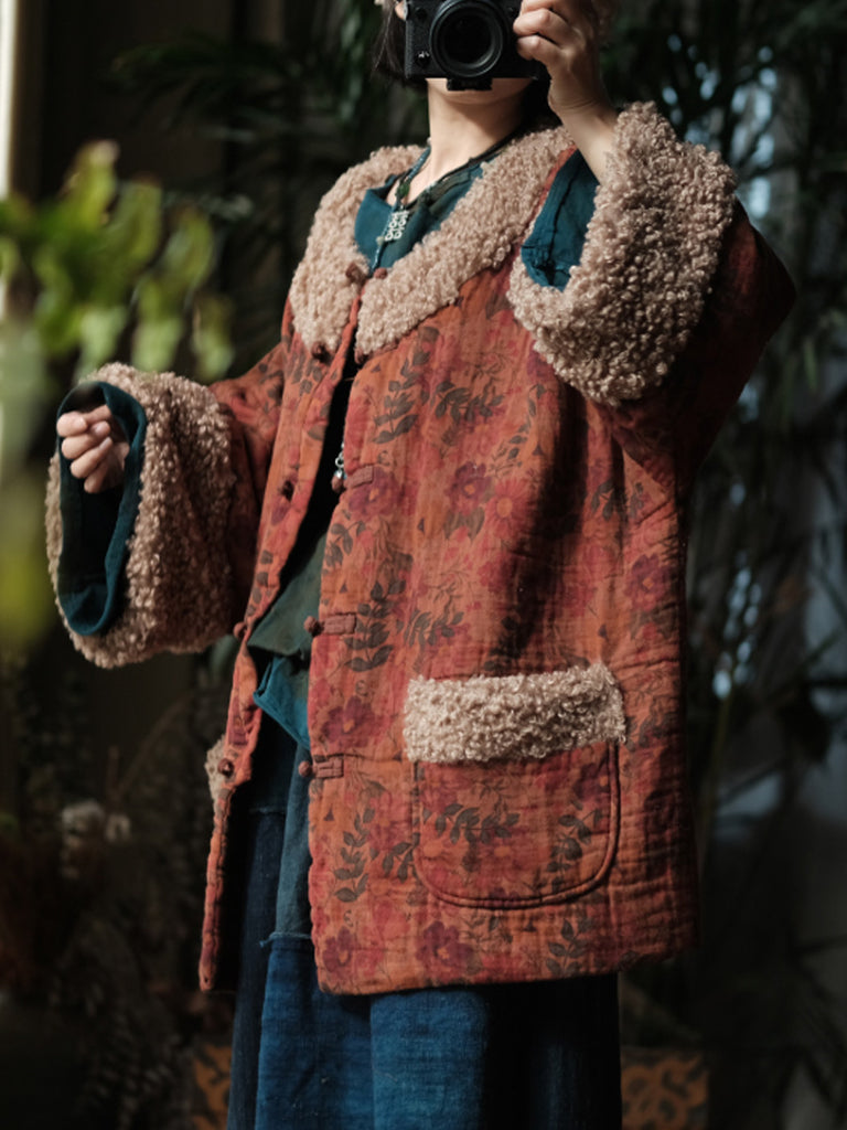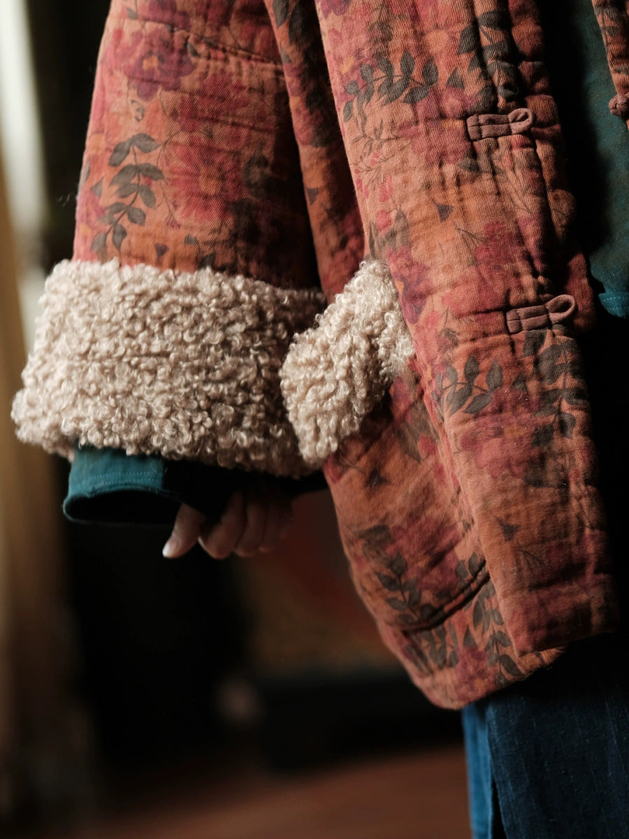 Ženski vintage zimski kaput od cvjetnog flisa s O-izrezom