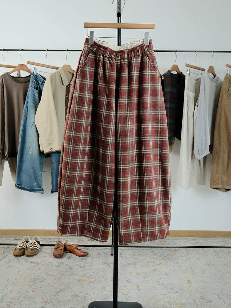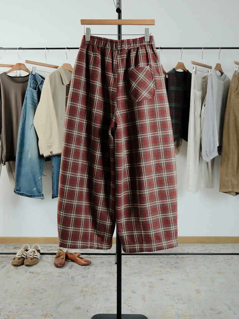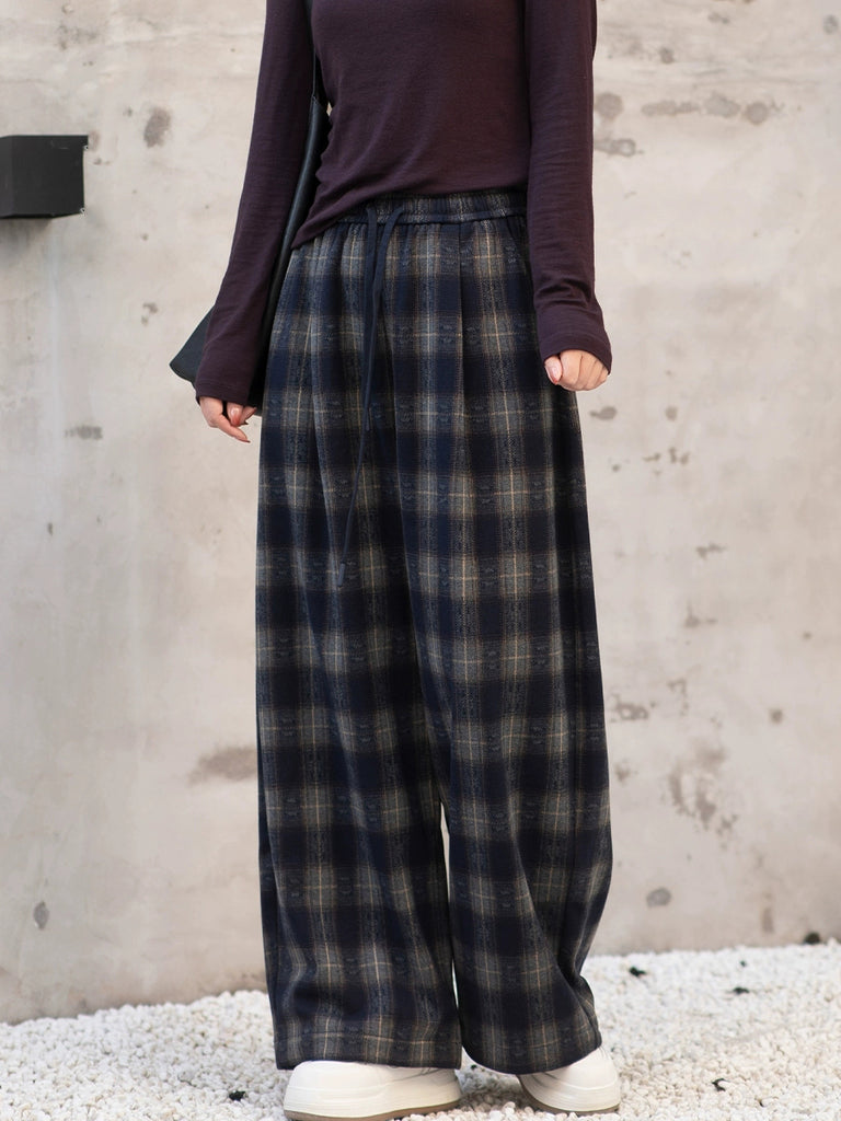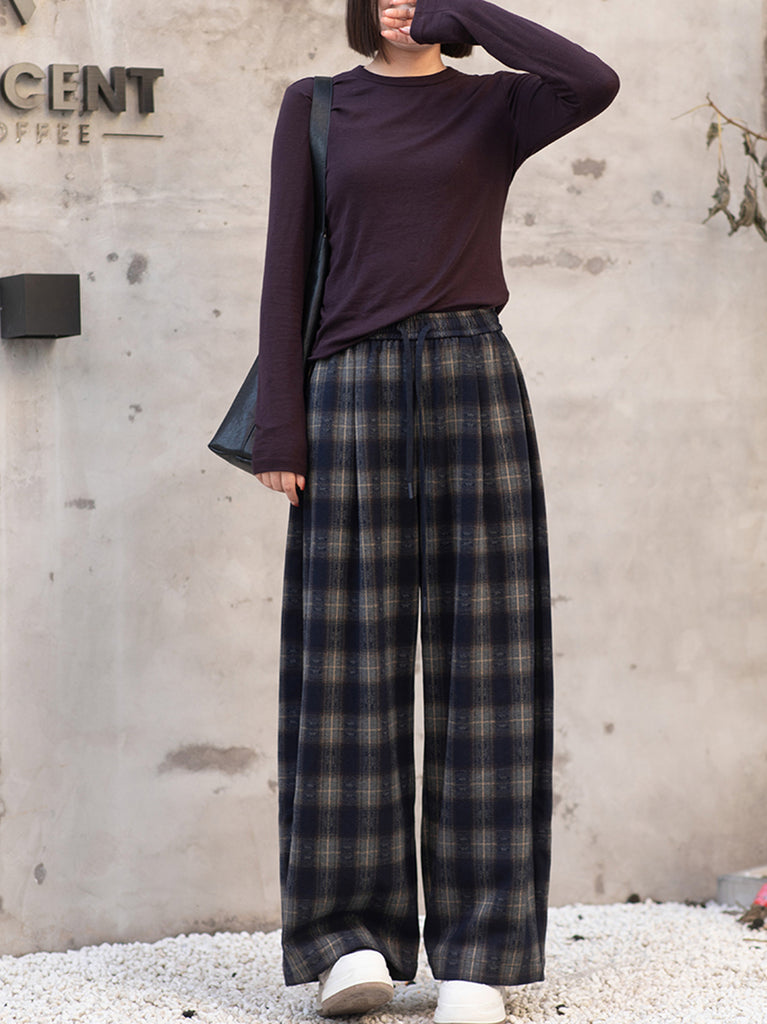 Ženske zimske vintage karirane hlače širokih nogavica s flis podstavom