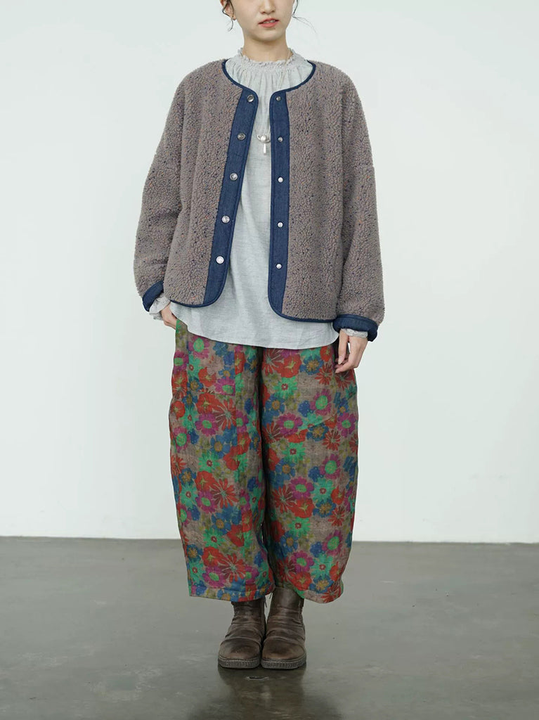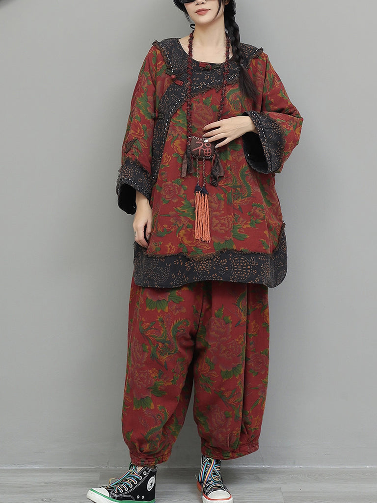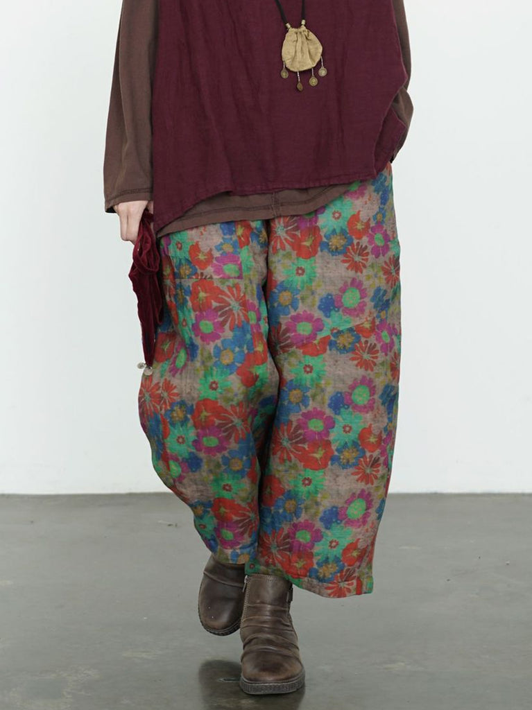 Ženske zimske vintage cvjetne podstavljene ravne hlače
