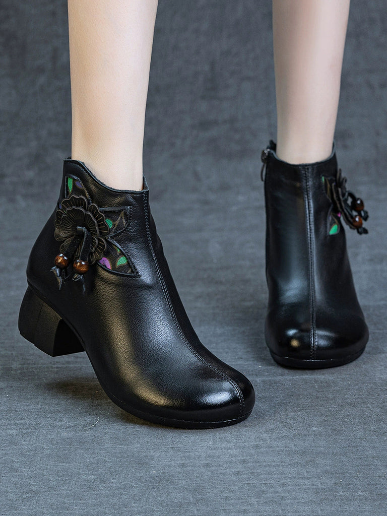 Ženske zimske gležnjače od kože s cvjetnim uzorkom i srednjom petom