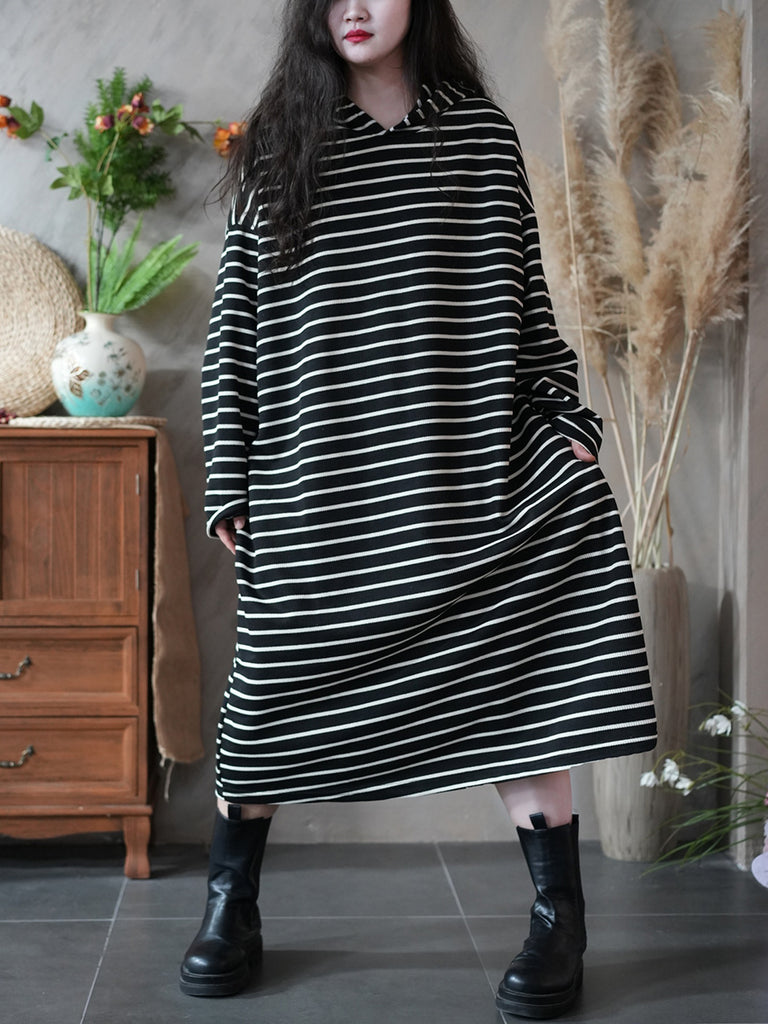 Ženska jesenska vintage prugasta haljina s kapuljačom