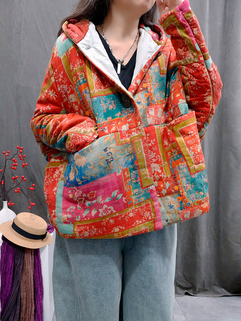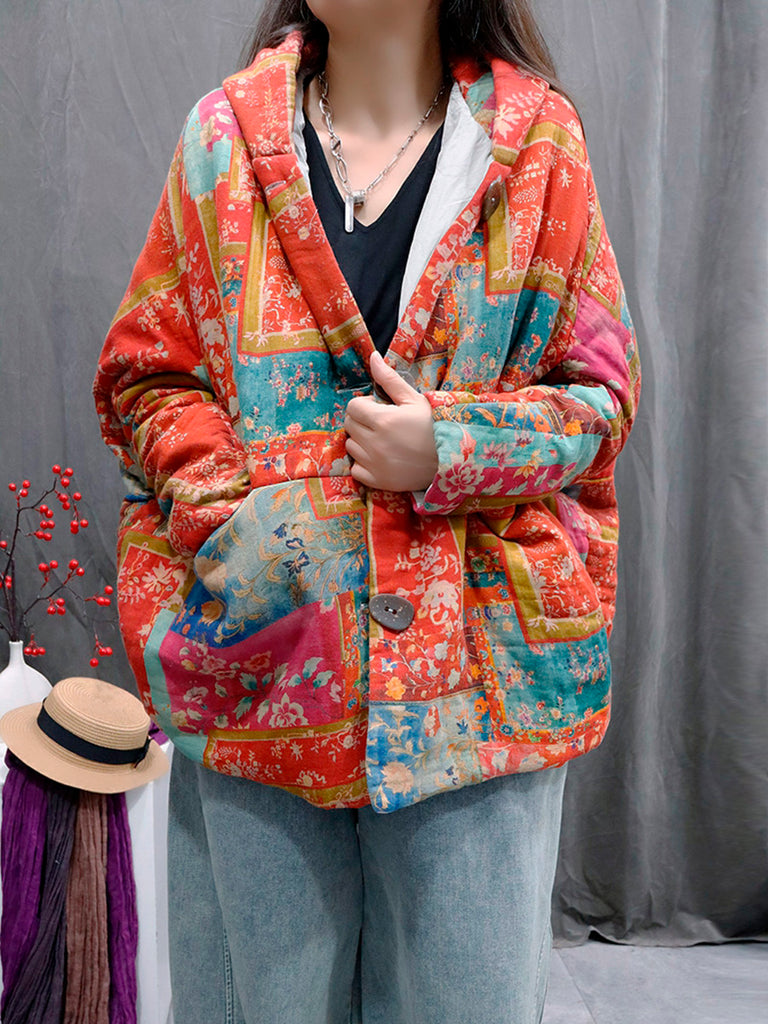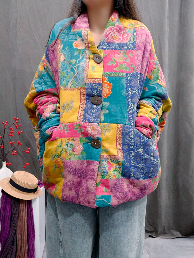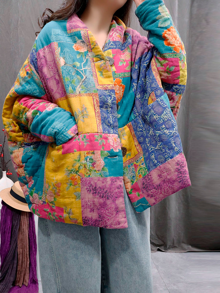 Ženski vintage zimski pamučni kaput s V-izrezom i cvjetnim patchworkom