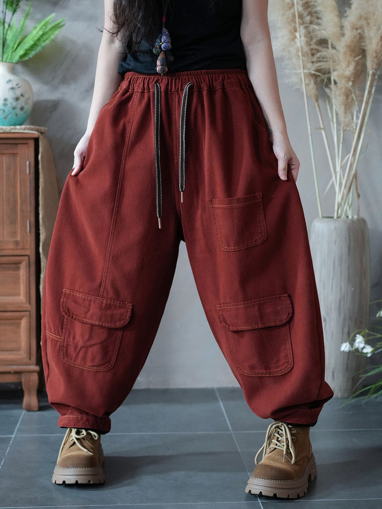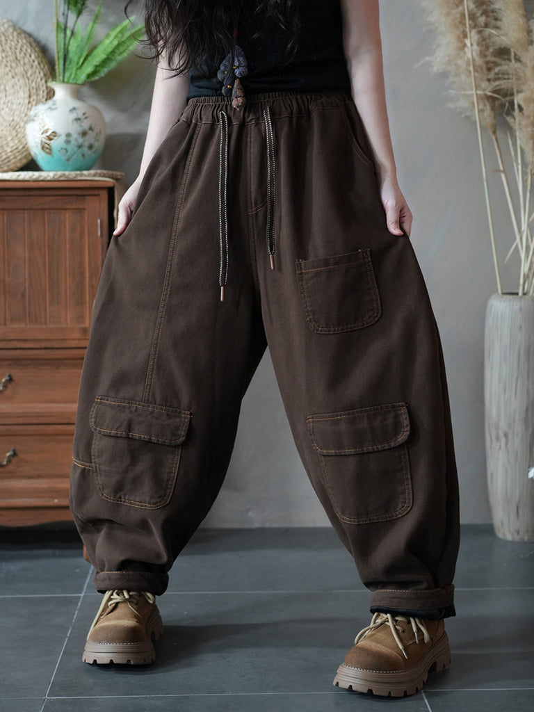 Ženske zimske retro harem hlače s džepovima u čistoj boji