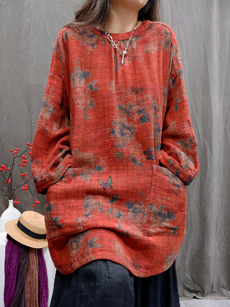 Ženska vintage jesenska cvjetna O-izrez bluza od 100% lana