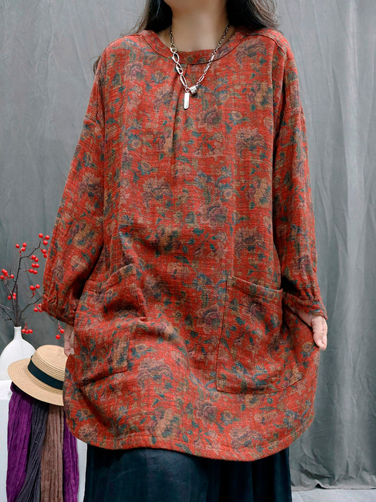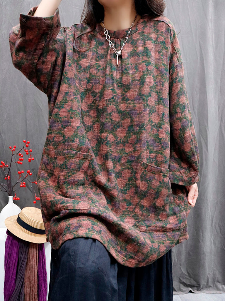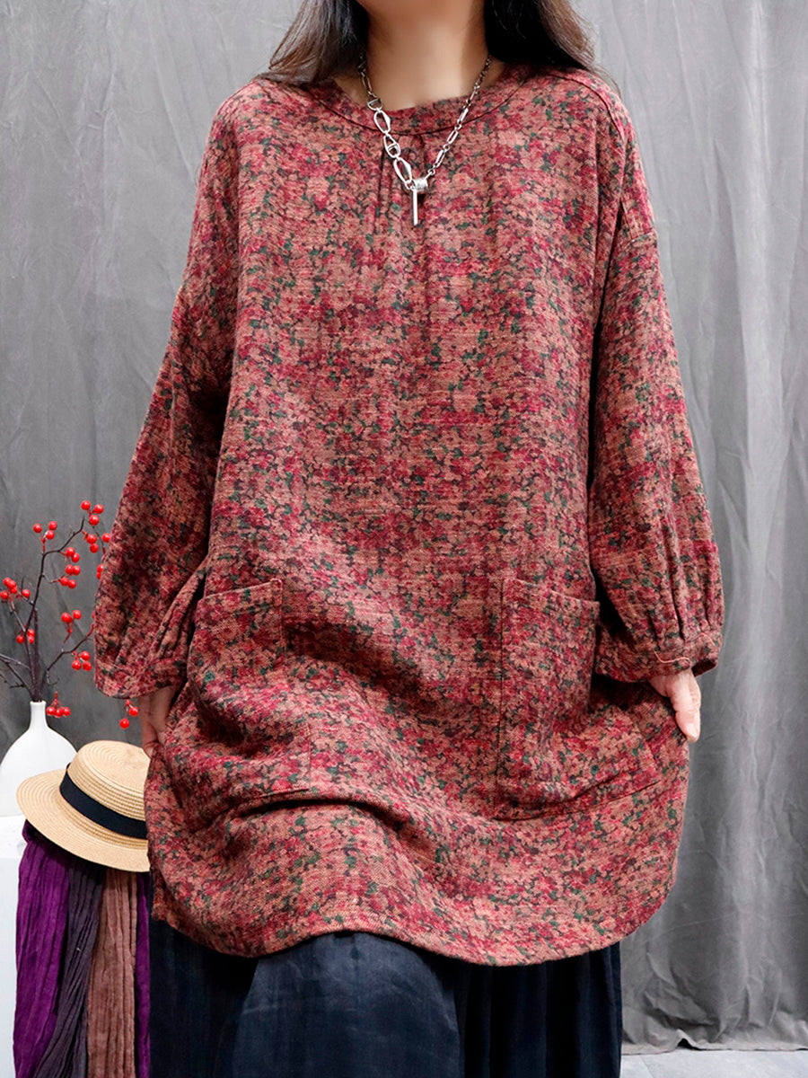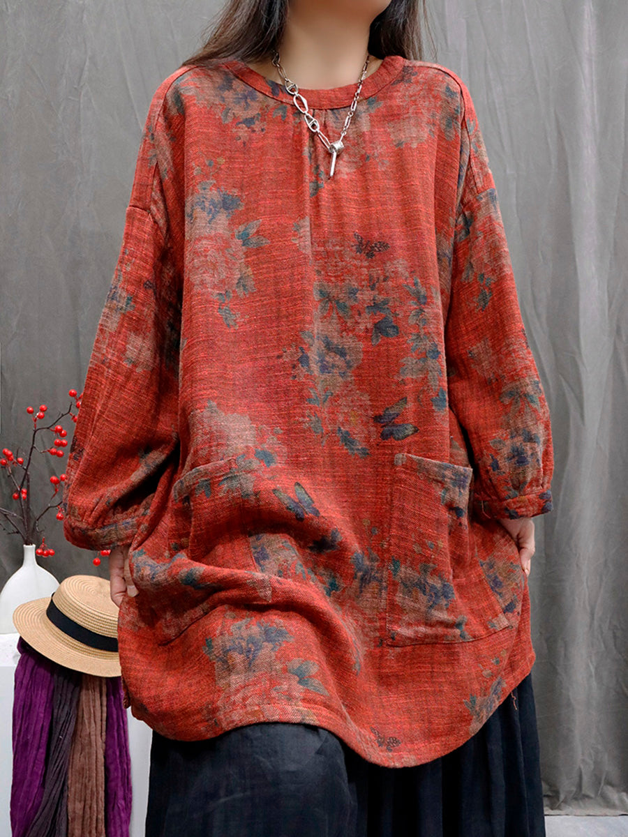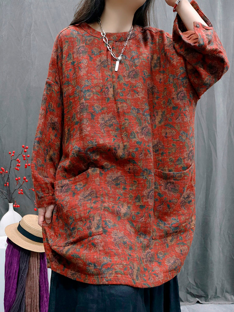 Ženska vintage jesenska cvjetna O-izrez bluza od 100% lana