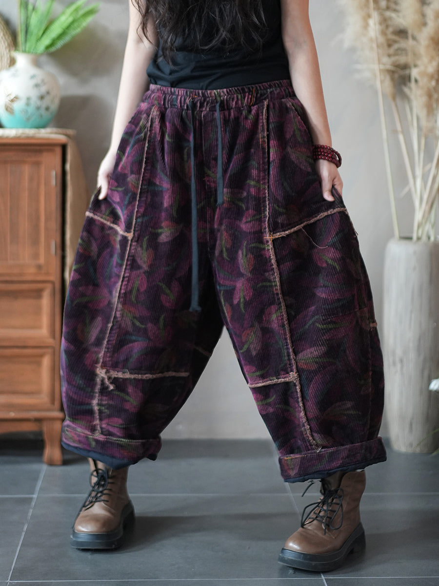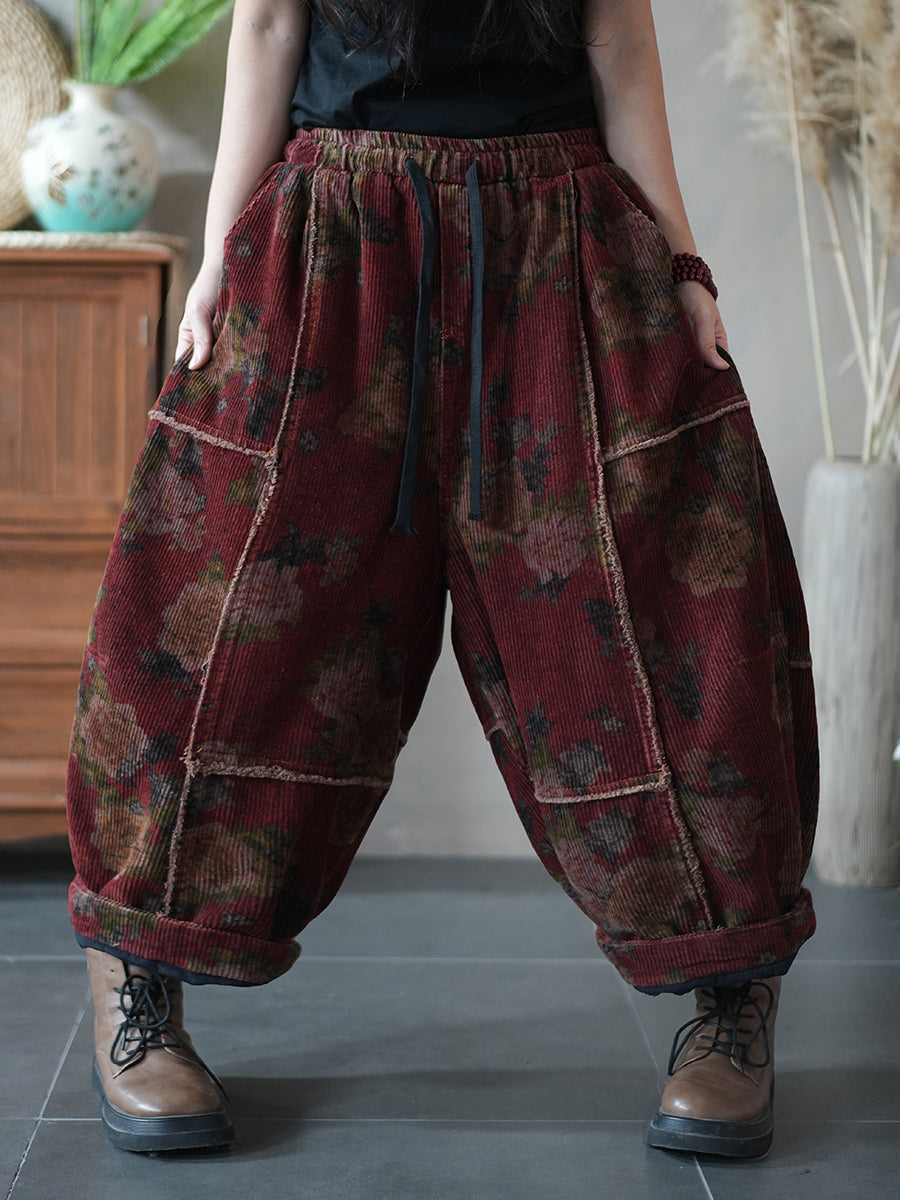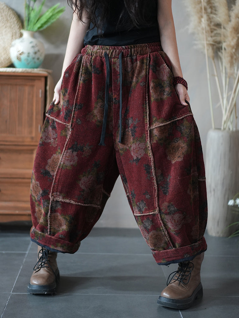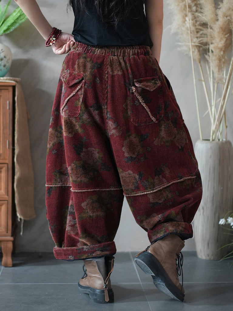 Ženske zimske retro korduroy harem hlače s cvjetnim uzorkom