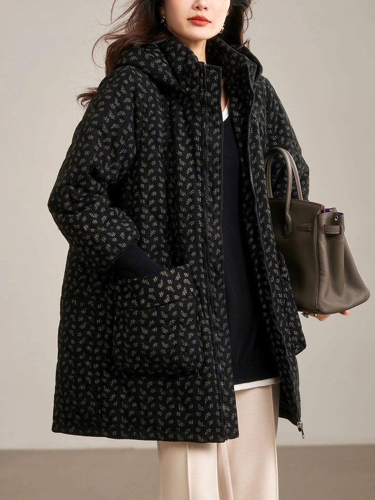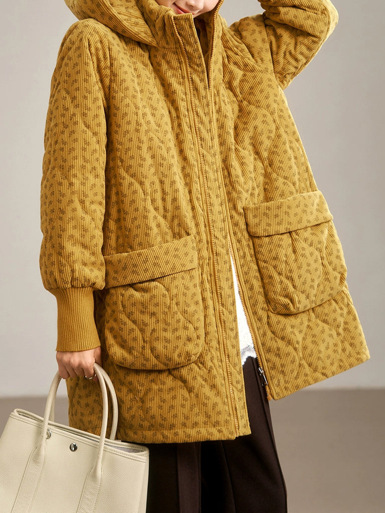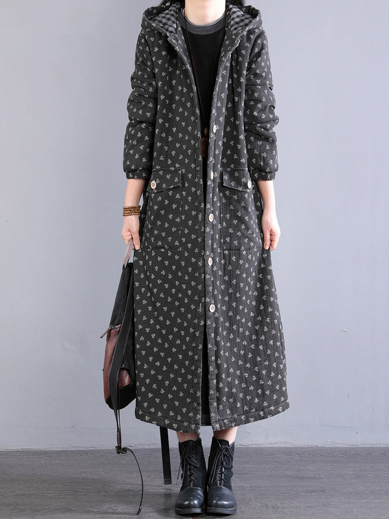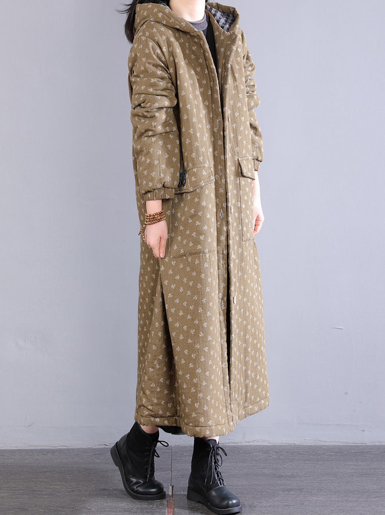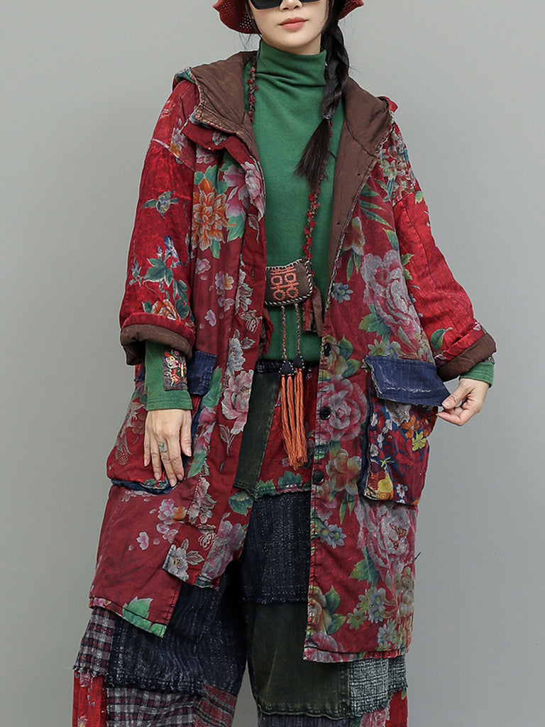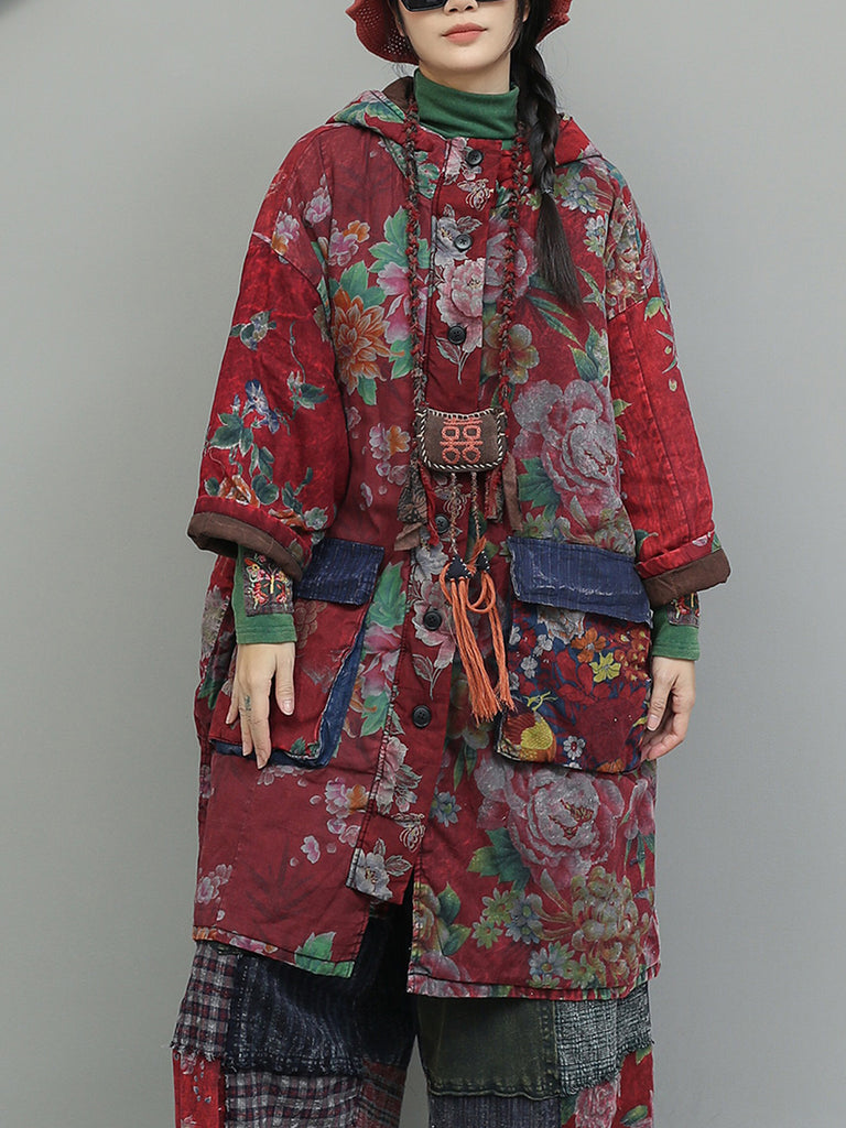 Ženski umjetnički zimski cvjetni podstavljeni kaput s kapuljačom