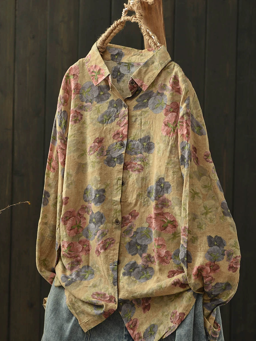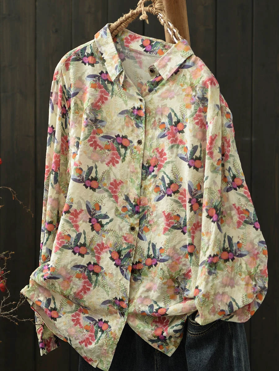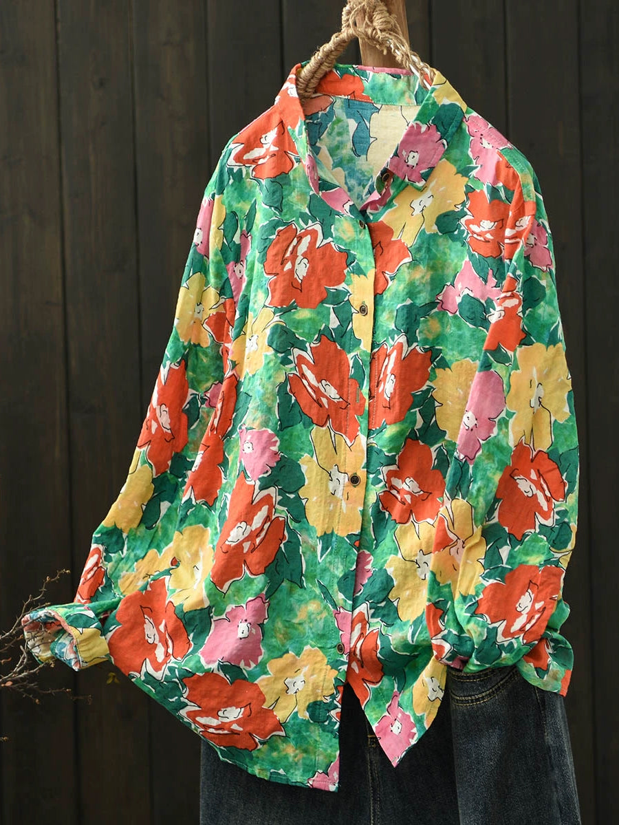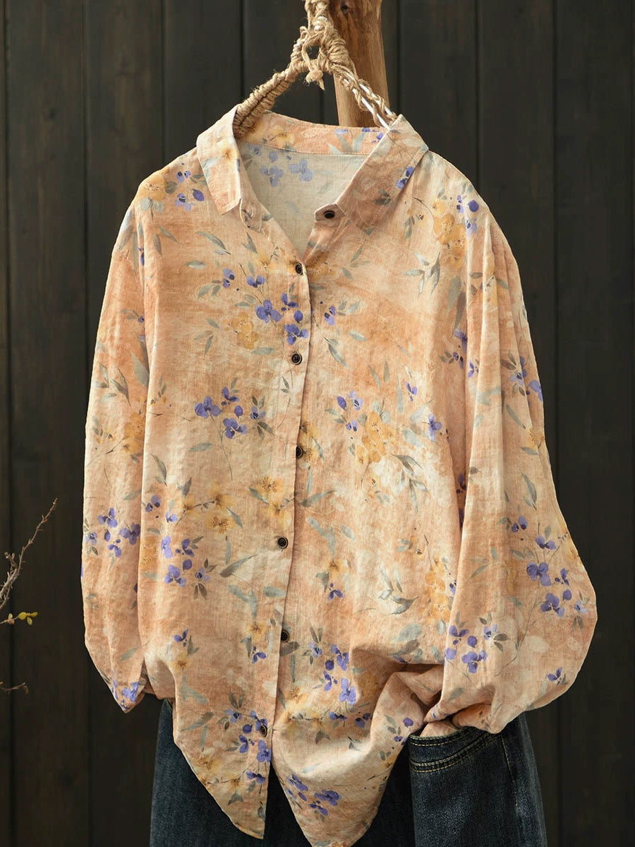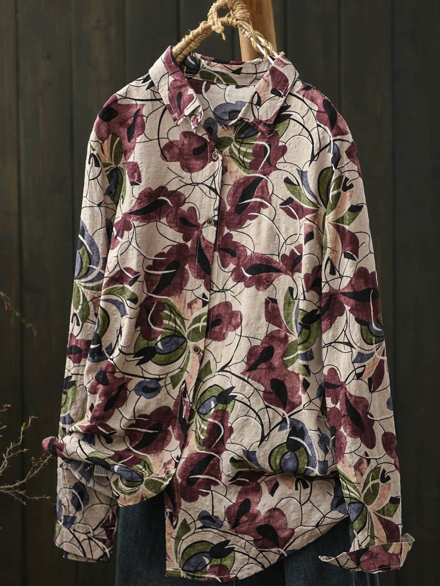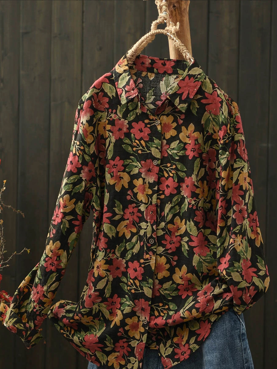 Ženska umjetnička pamučna bluza s ovratnikom i proljetnim cvijećem