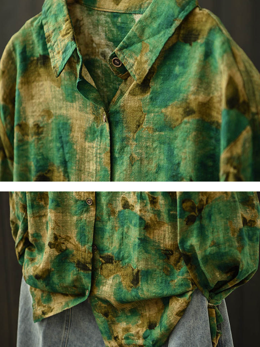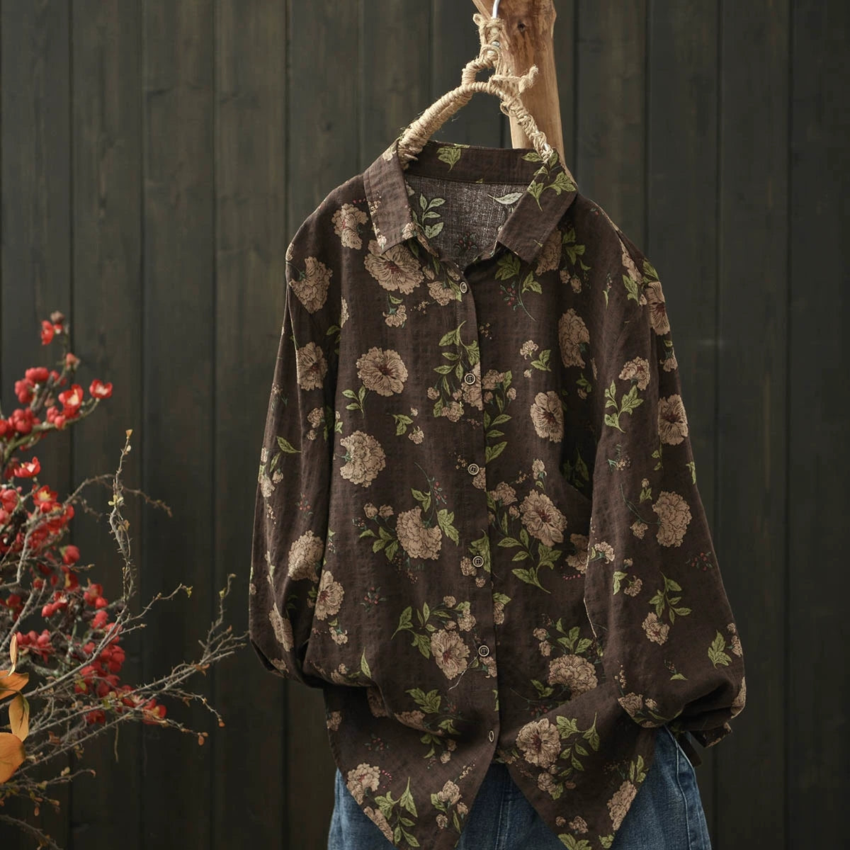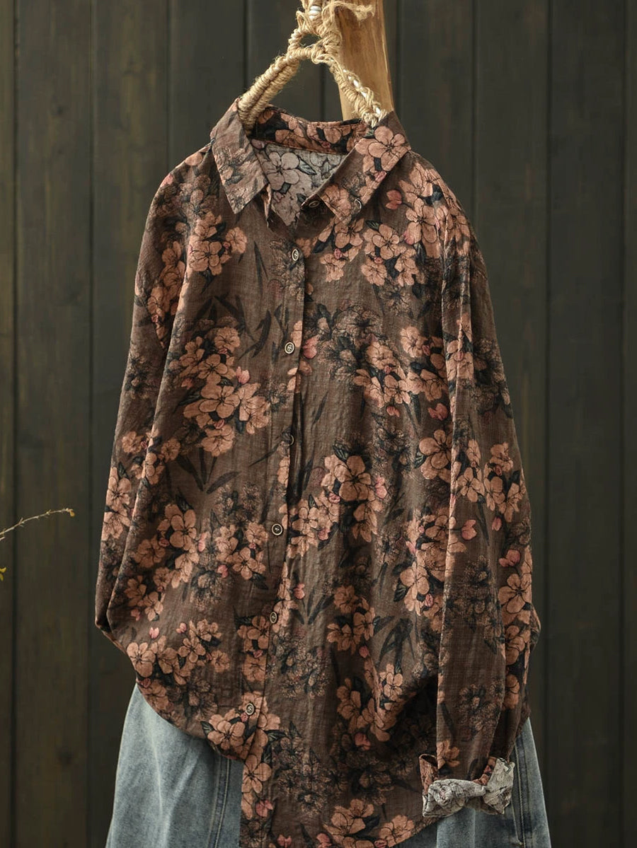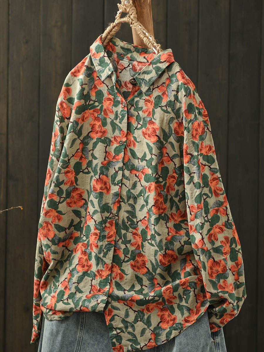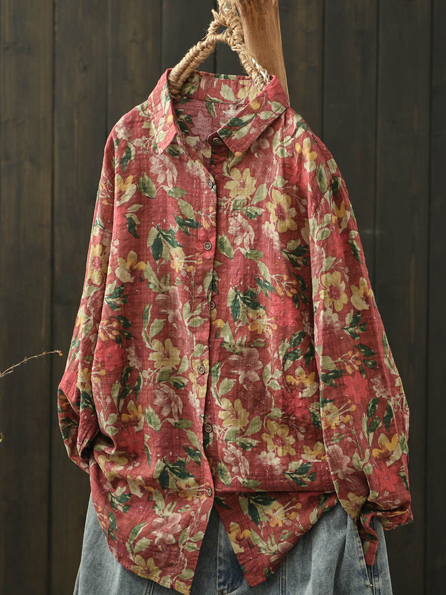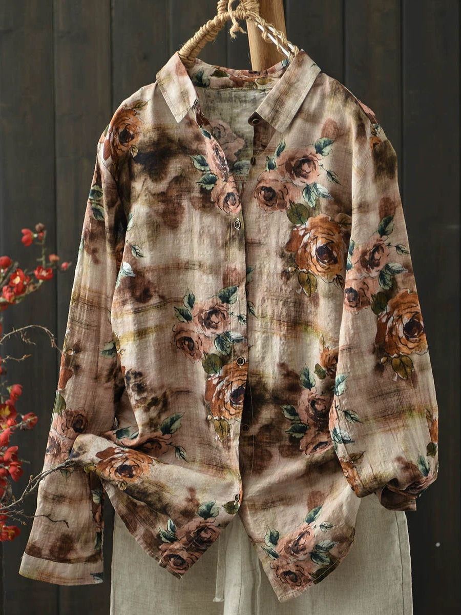 Ženska umjetnička pamučna bluza s ovratnikom i proljetnim cvijećem