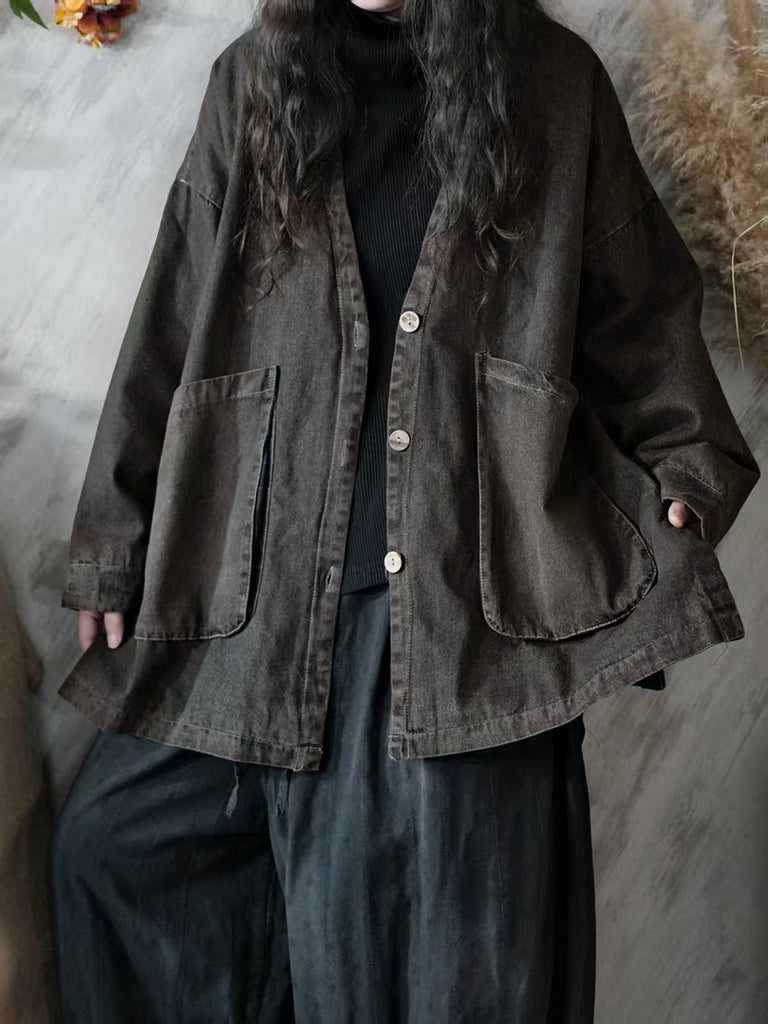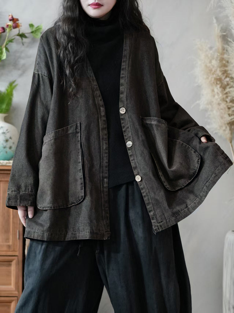 Ženski vintage jesenski kaput od trapera s V-izrezom u čistoj boji