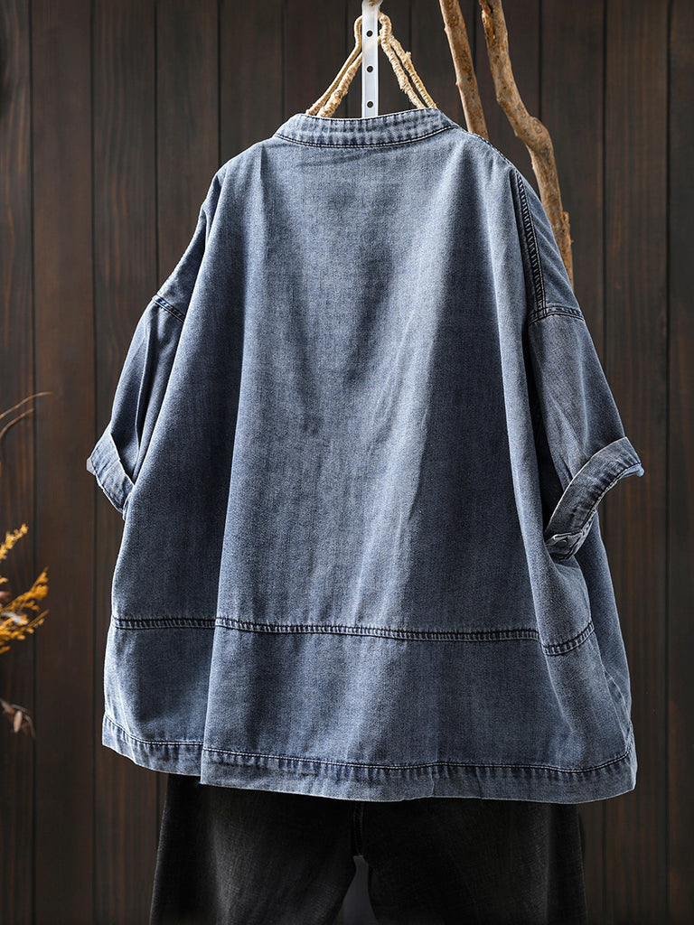Ženska ljetna retro traper košulja čiste boje sa samostojećim ovratnikom