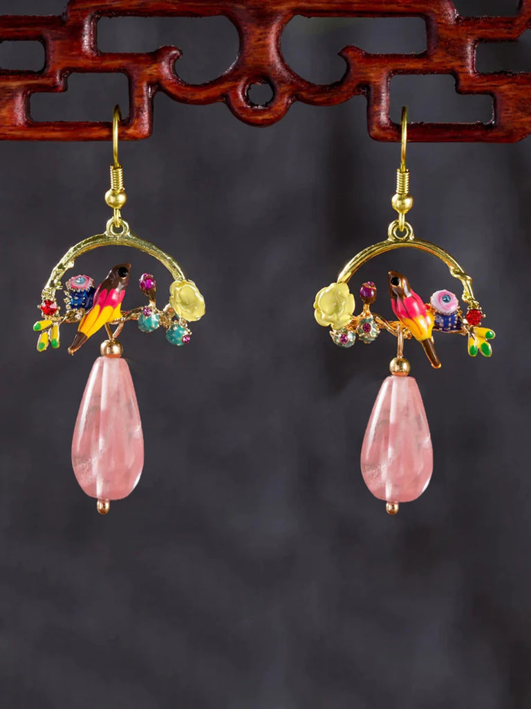 Naušnice s privjeskom u obliku ptica i cvijeta od kalcedona