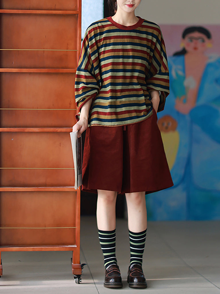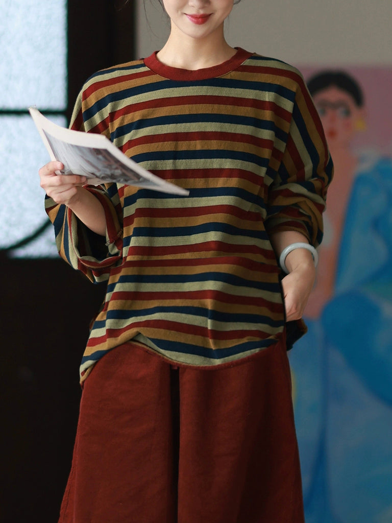 Ženska jesenska ležerna prugasta bluza s O-izrezom od 100% pamuka