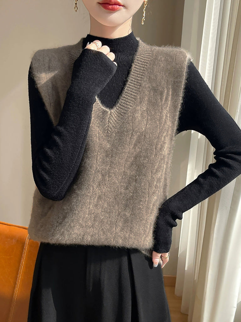 Ženski jesenski ležerni pleteni prsluk čistih boja s V-izrezom
