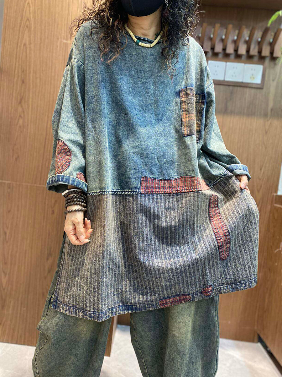 Ženska ljetna retro traper bluza s patchwork uzorkom