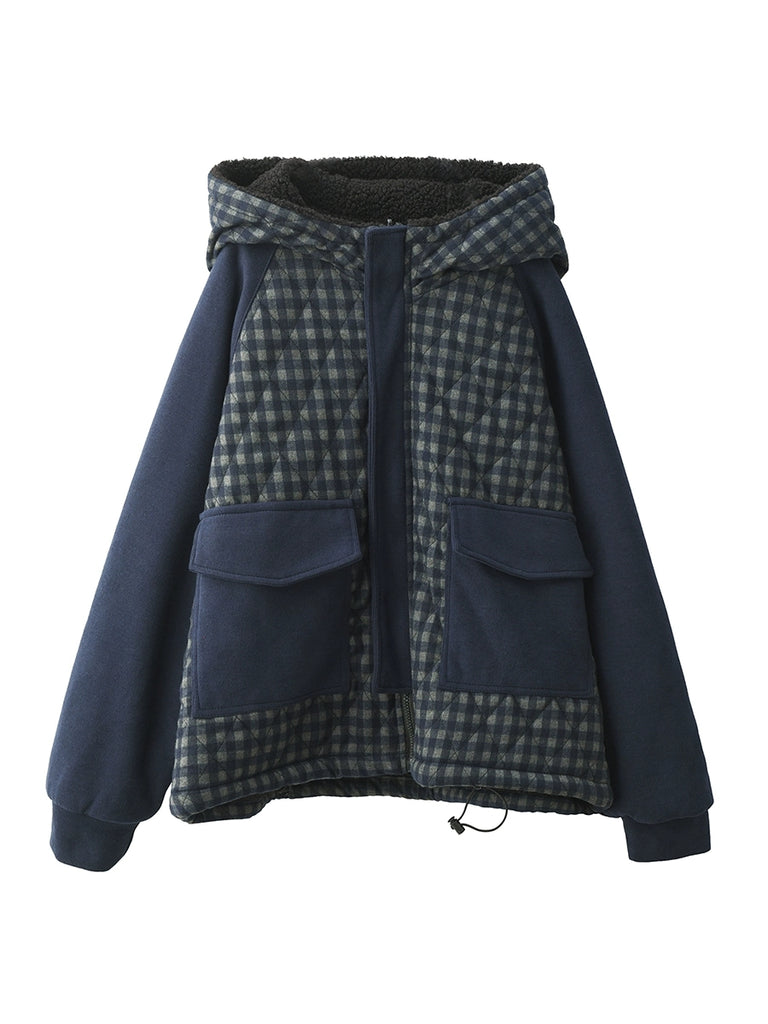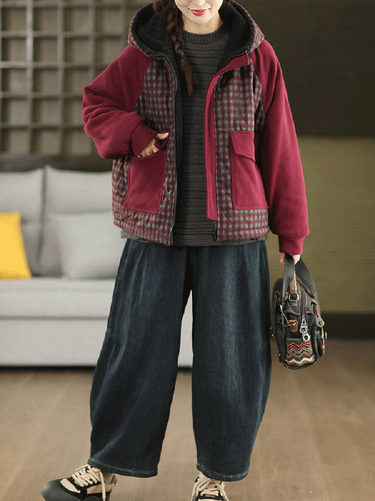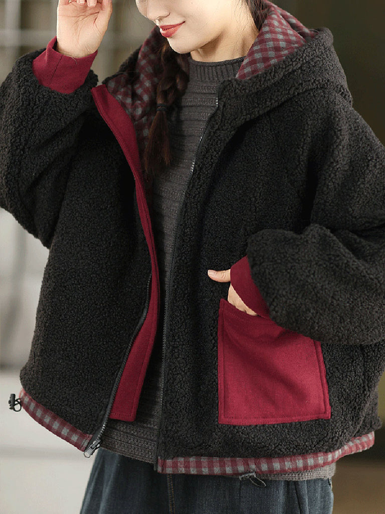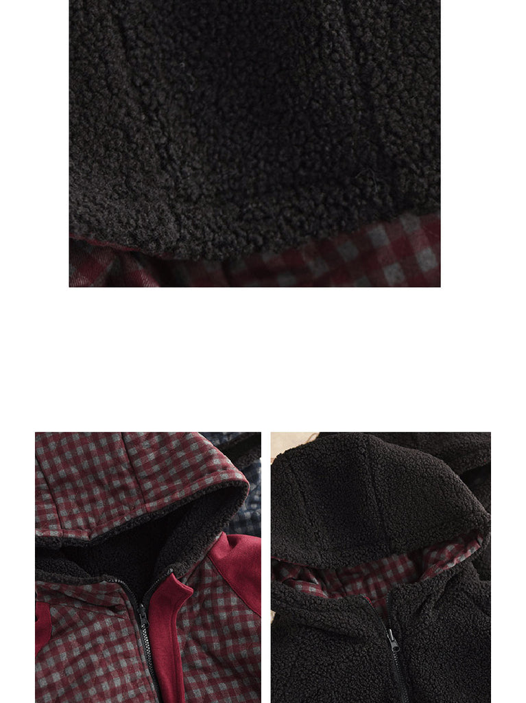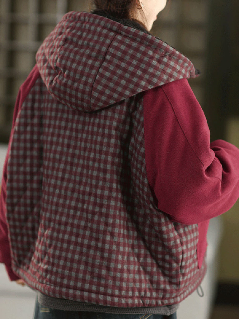 Ženski zimski karirani kaput s kapuljačom i flis podstavom, s dvostrukim nošenjem