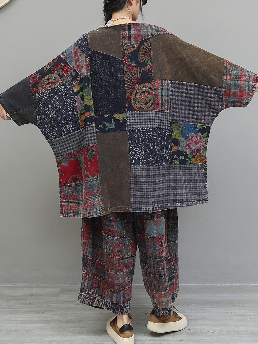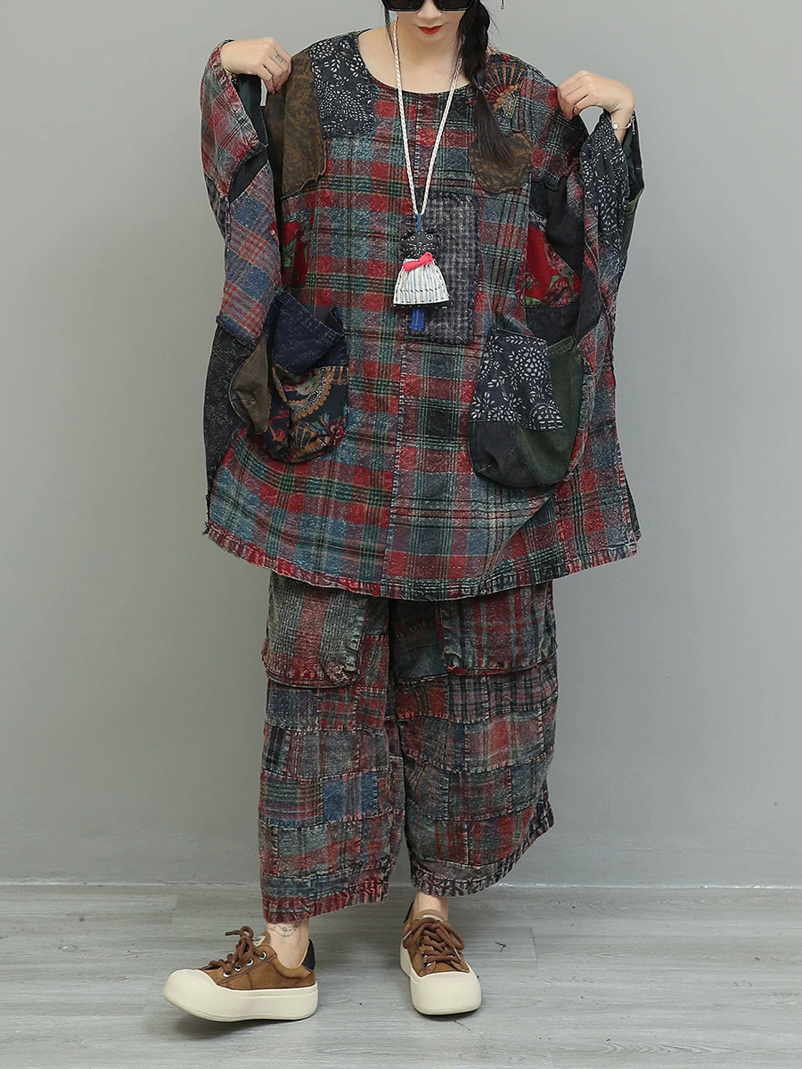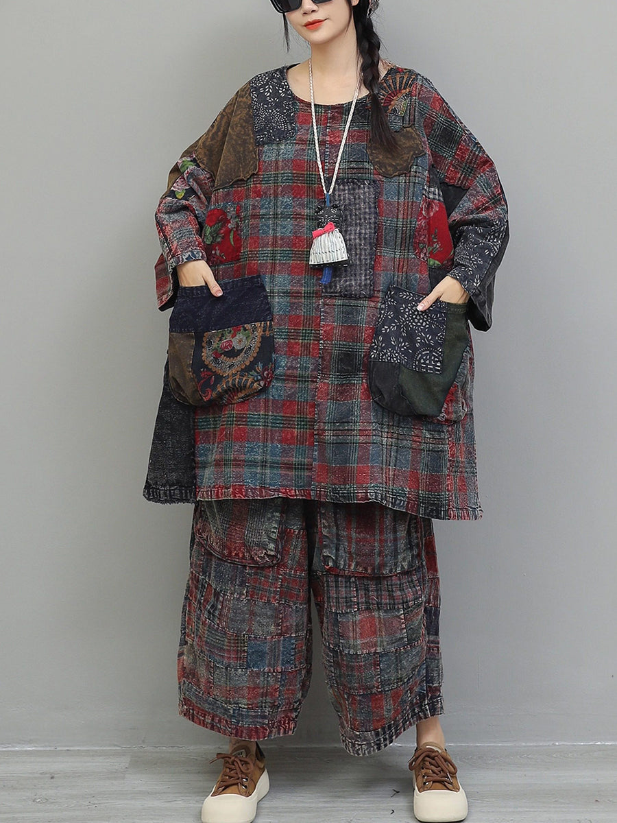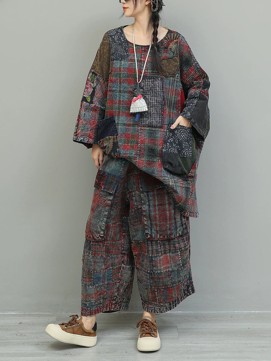 Women Winter Retro Patchwork O-Neck Suits