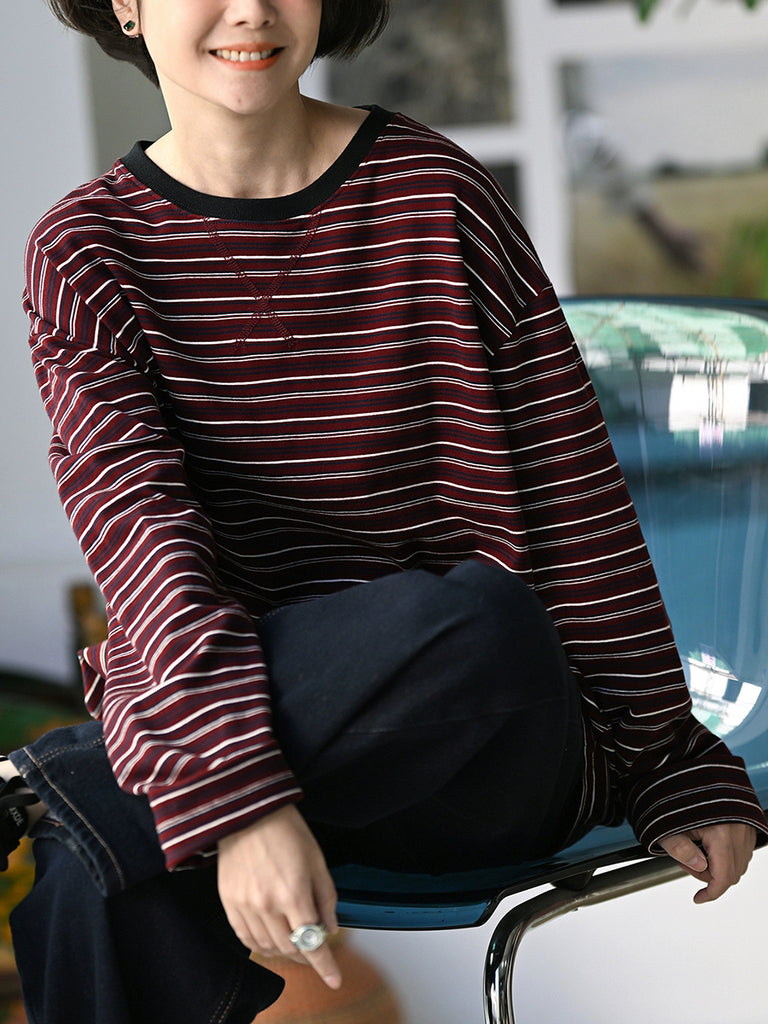 Women Autumn Artsy Stripe Knitted O-Neck Sweater