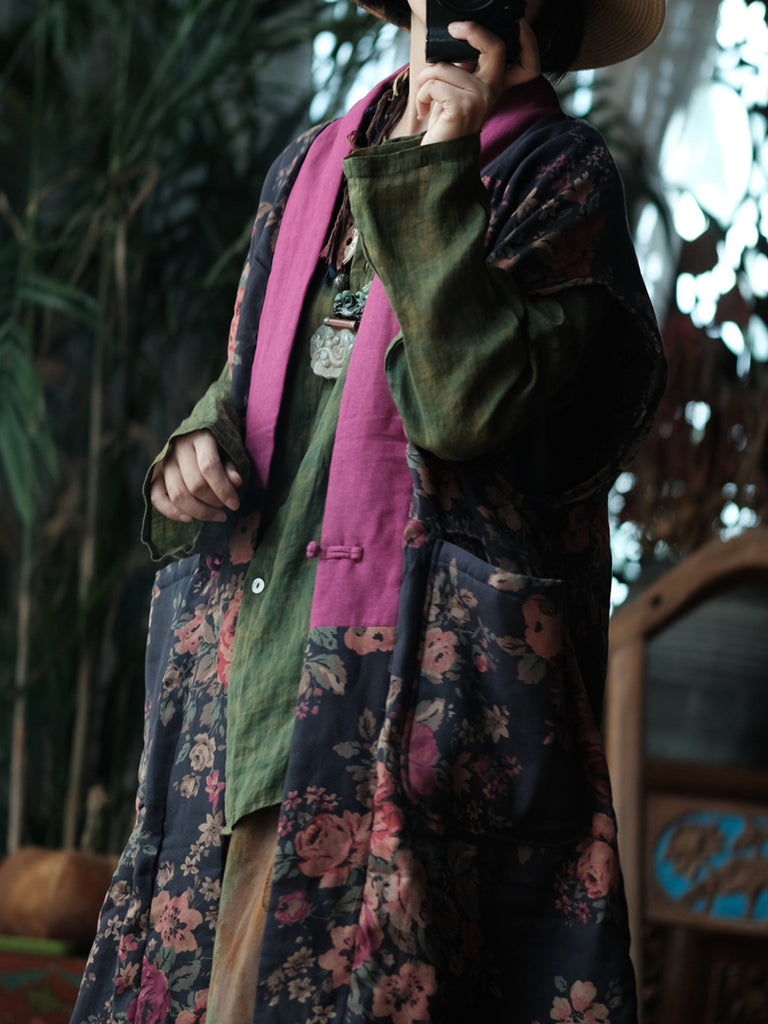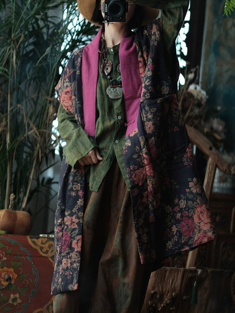 Women Winter Retro Flower Spliced V-Neck Long Vest Coat