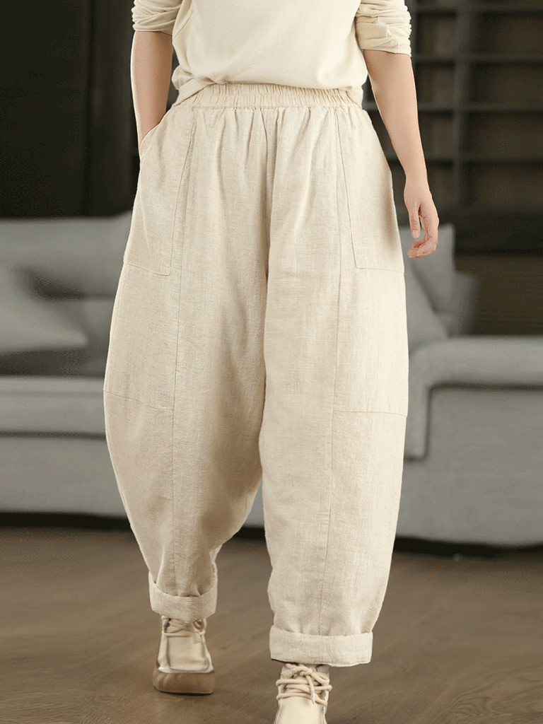 Women Autumn Pure Color 100%Hemp Wide-leg Padded Pants