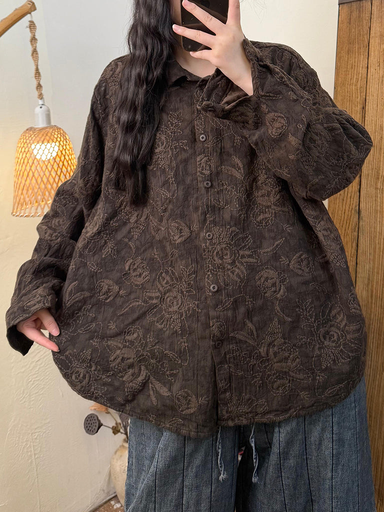 Women Autumn Retro Flower Embroidery Turn-down Collar Shirt