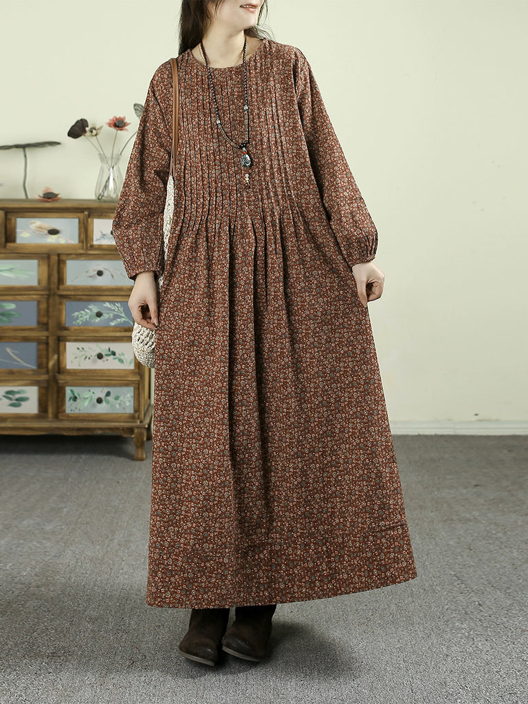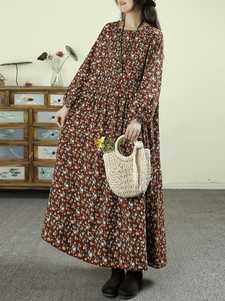 Women Autumn Artsy Floral O-Neck Cotton Linen Maxi Dress