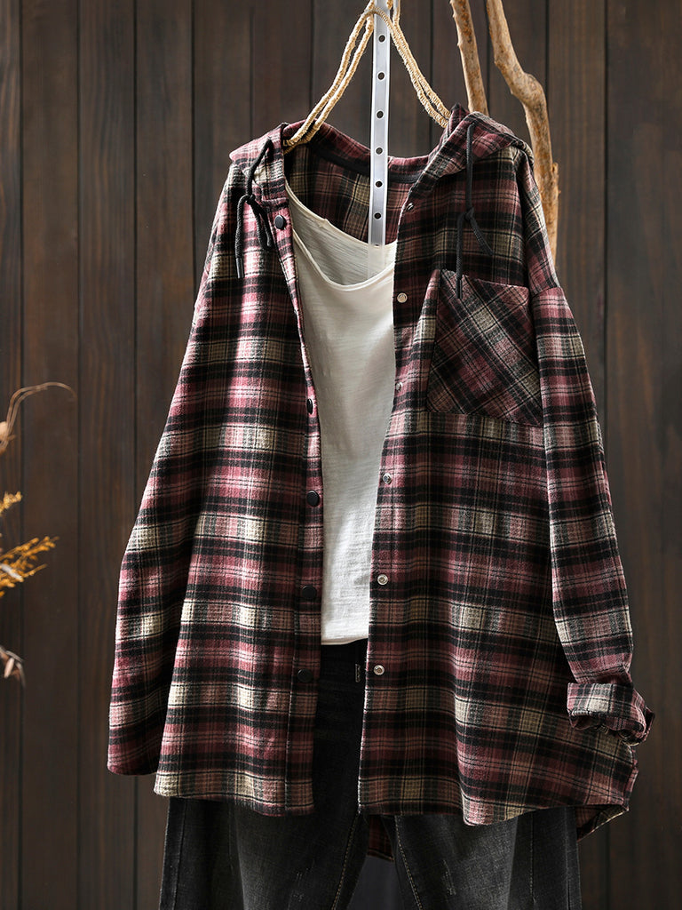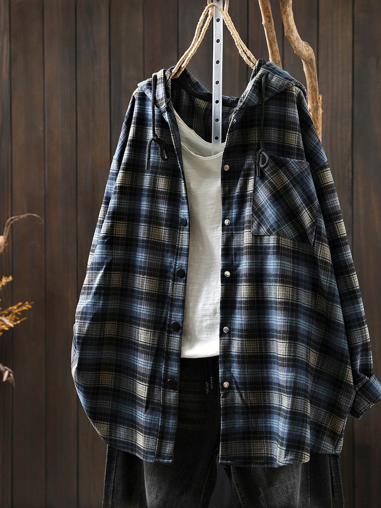 Women Autumn Plaid Cotton Hooded Shirt