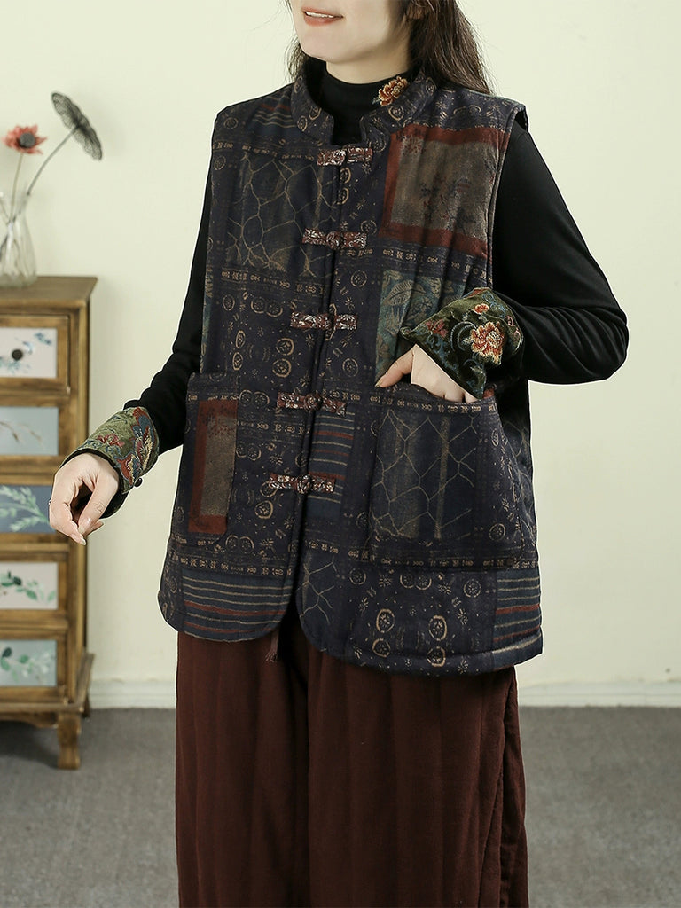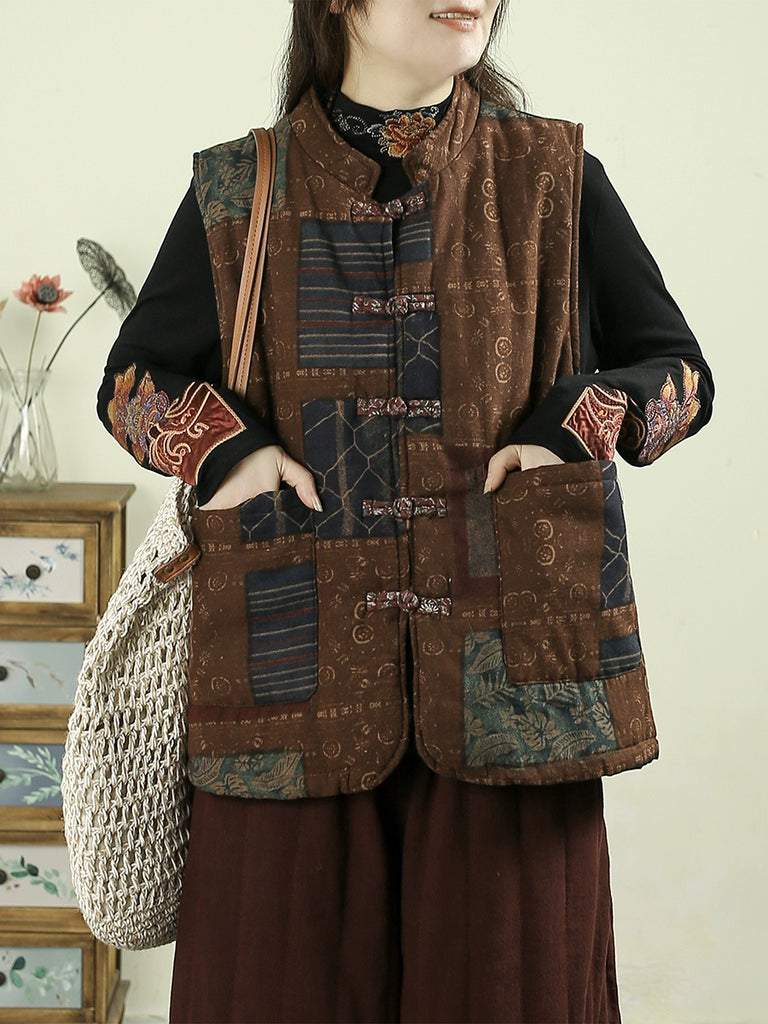 Women Autumn Ethnic Patchwork Stand Collar Padded Vest