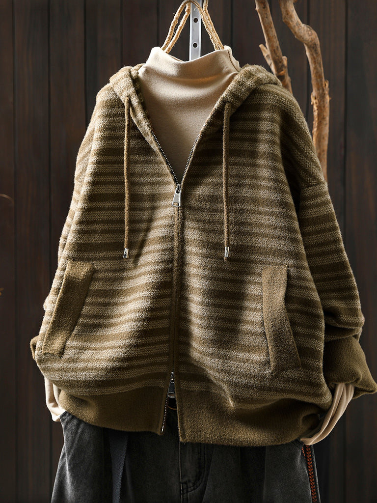 Women Autumn Artsy Stripe Knitted Hooded Jacket