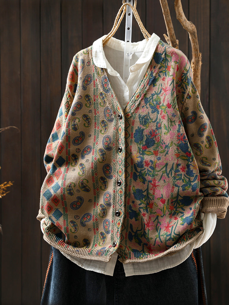 Women Autumn Flower V-Neck Knitted Sweater Coat