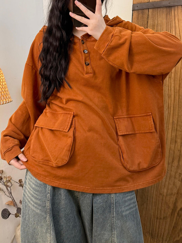 Women Autumn Vintage Pure Color Cotton Hoodie