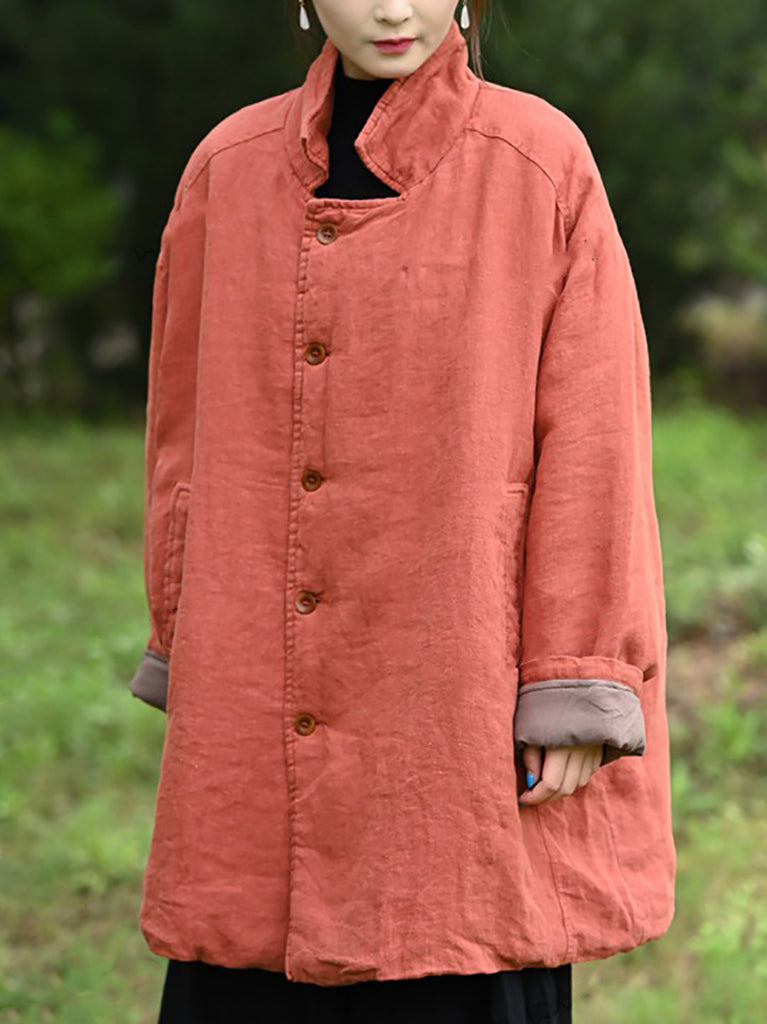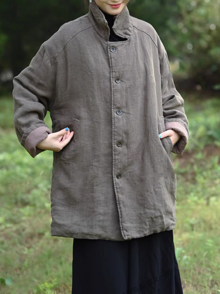 Women Winter Colorblock V-Neck 100%Linen Jacket
