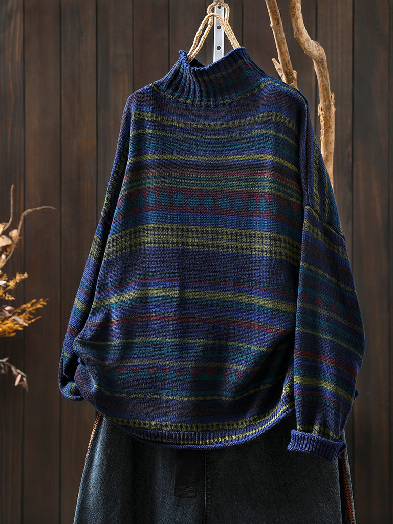 Women Autumn Vintage Stripe Half-Turtleneck Sweater