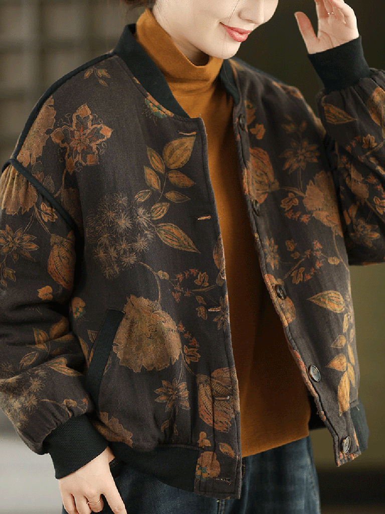 Women Autumn Retro Flower Turn-down Collar Padded Jacket