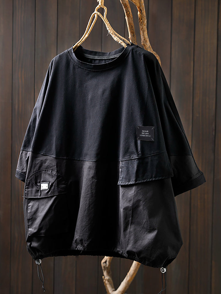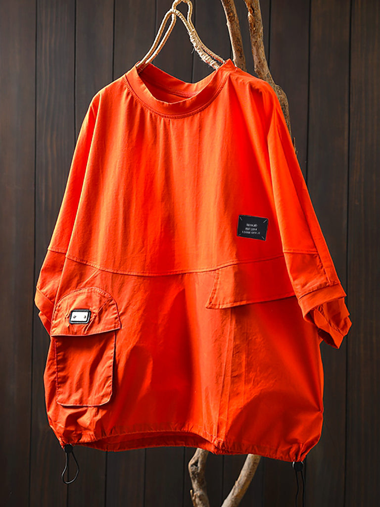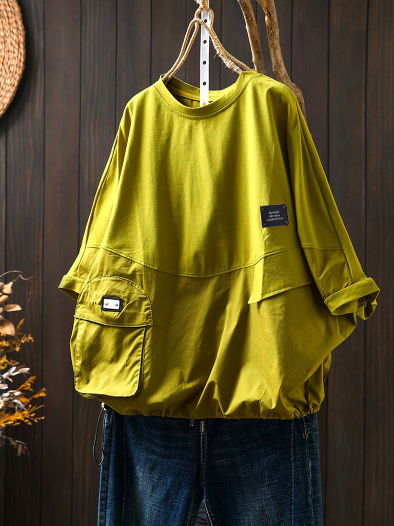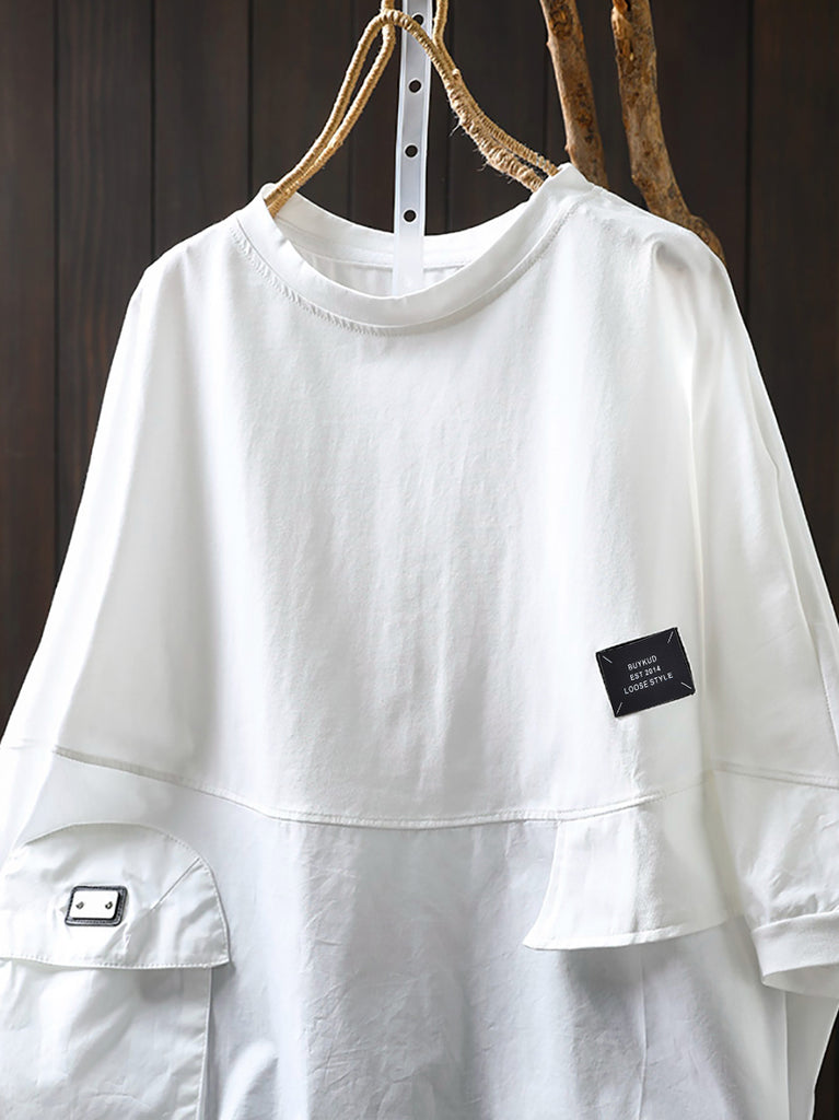 Plus Size Women Summer Pocket Pure Color O-Neck Cotton Shirt