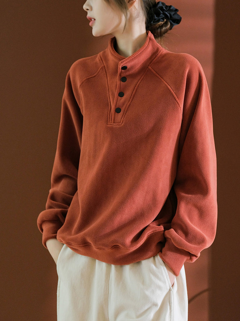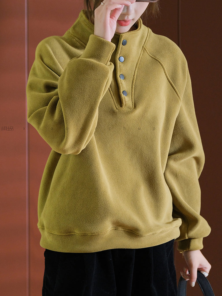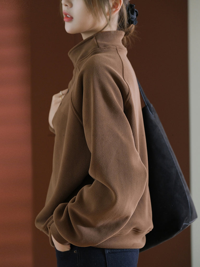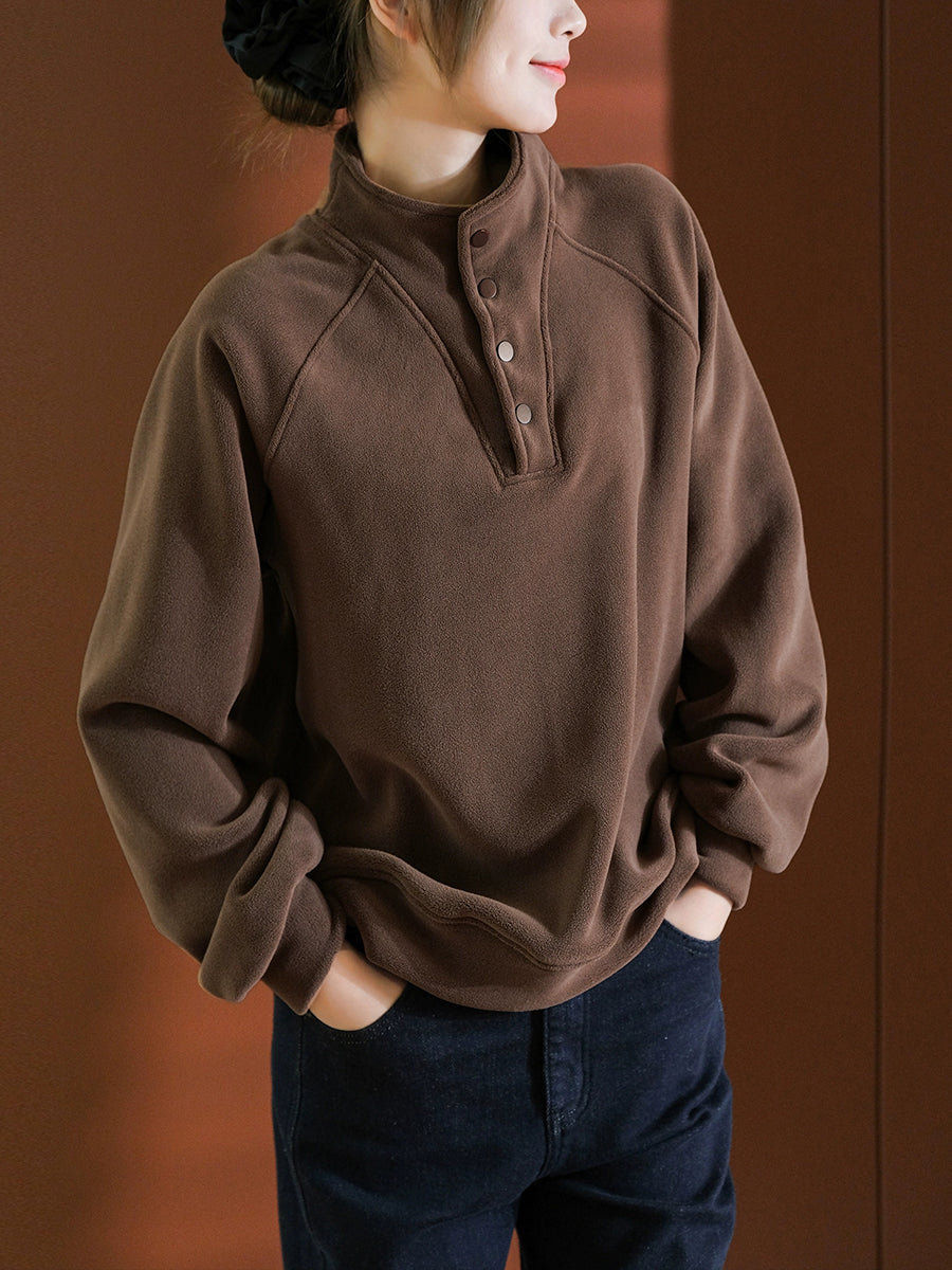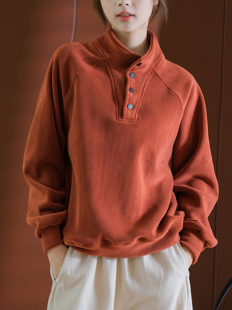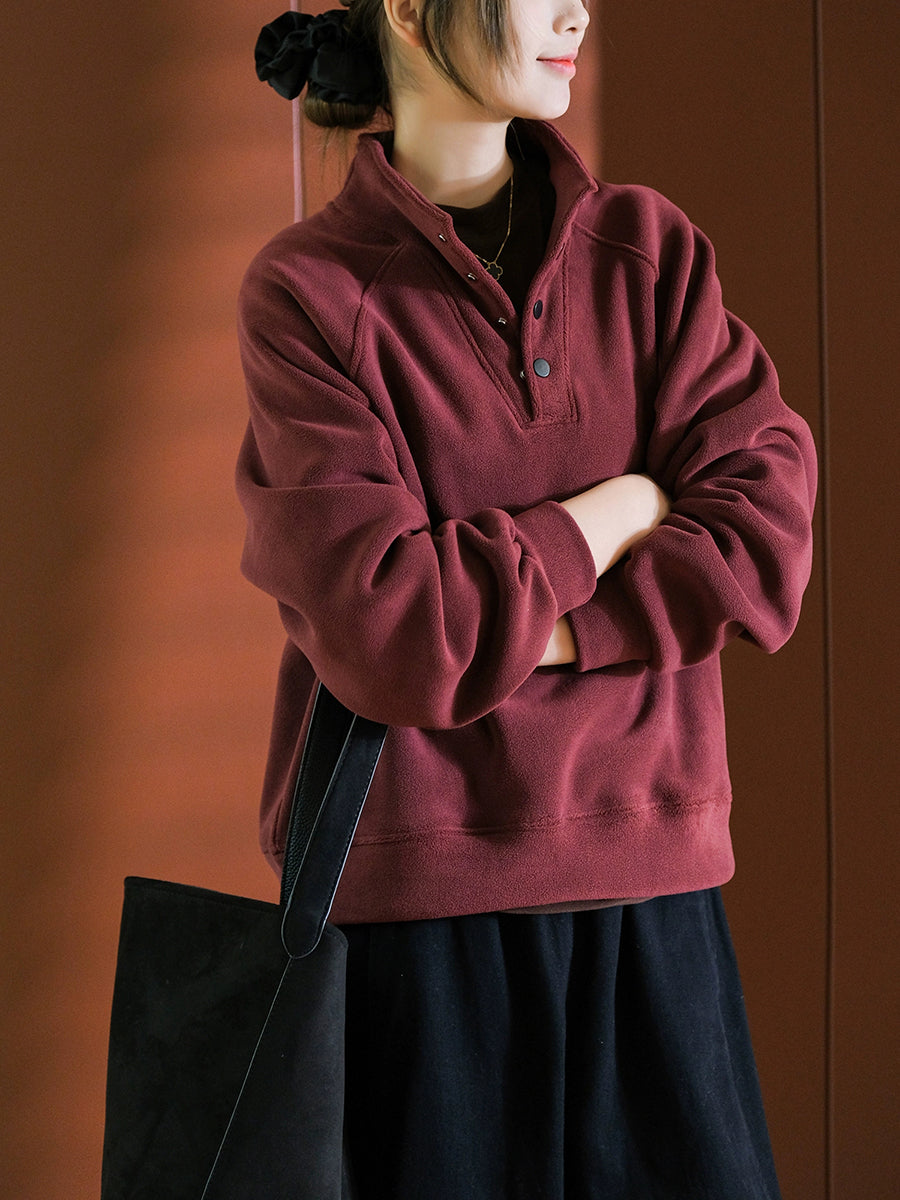Women Casual Autumn Pure Color Fleece Stand Collar Blouse