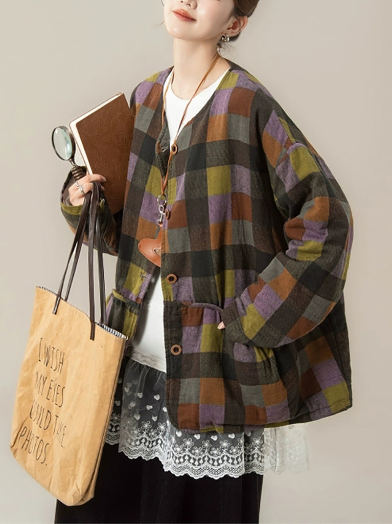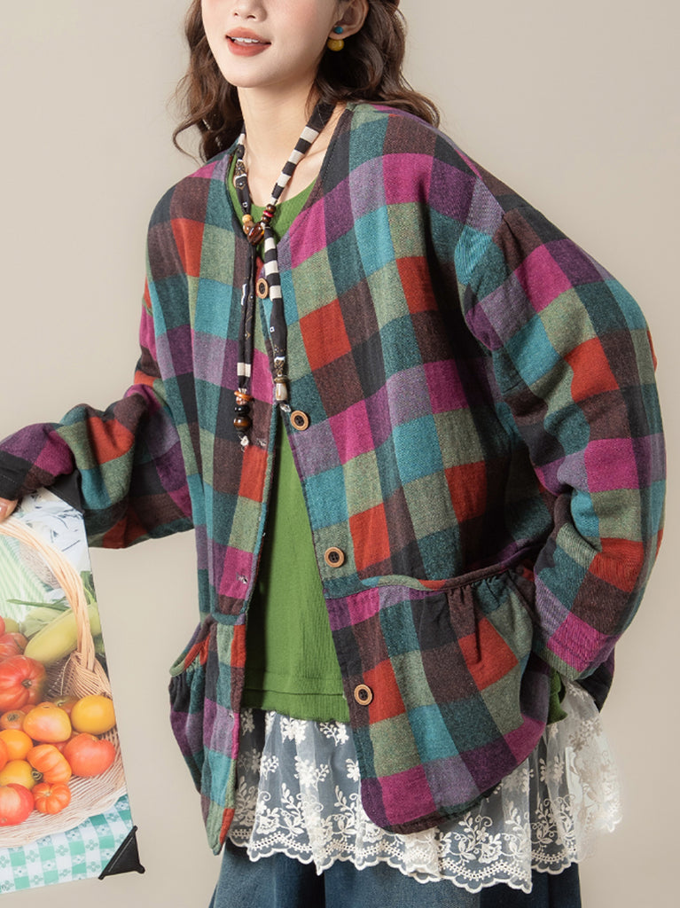Women Autumn Vintage Plaid O-Neck Coat