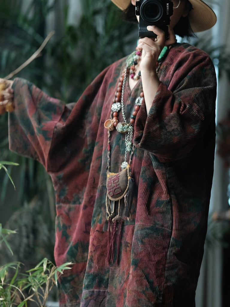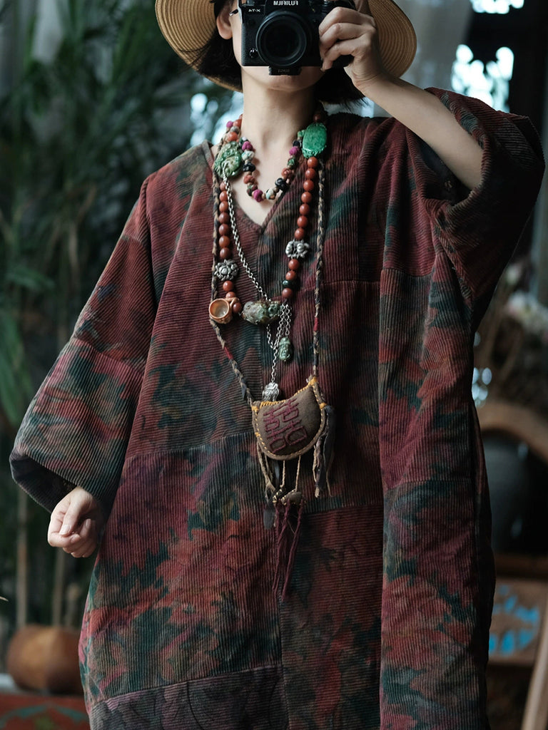 Women Vintage Winter Flower V-Neck Cotton Robe Coat