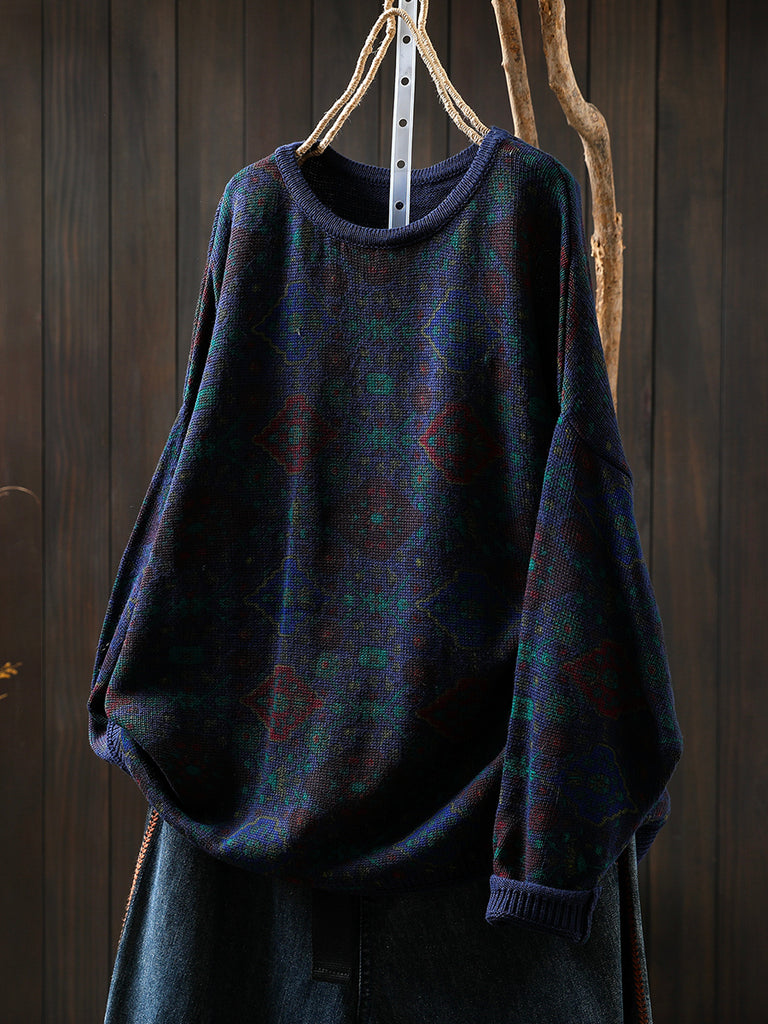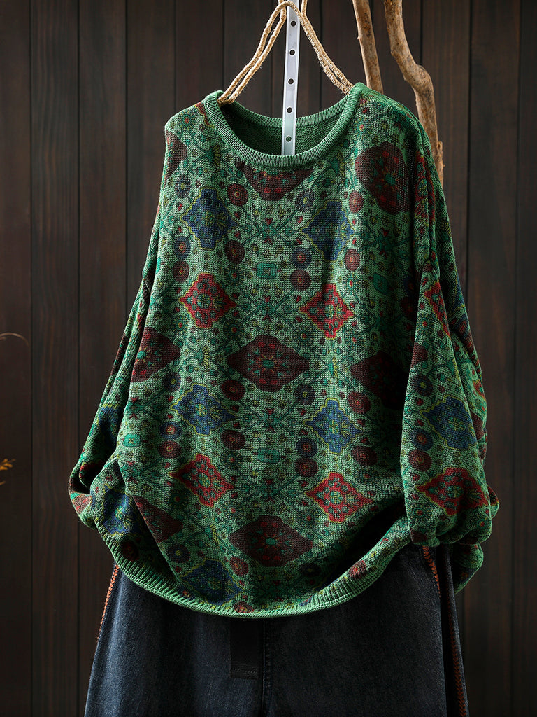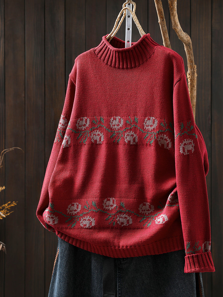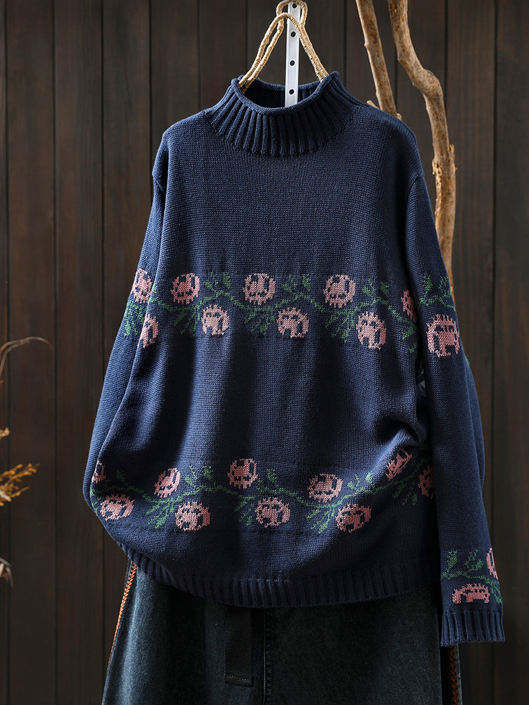 Women Vintage Autumn Flower Half-Turtleneck Sweater
