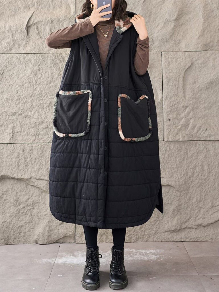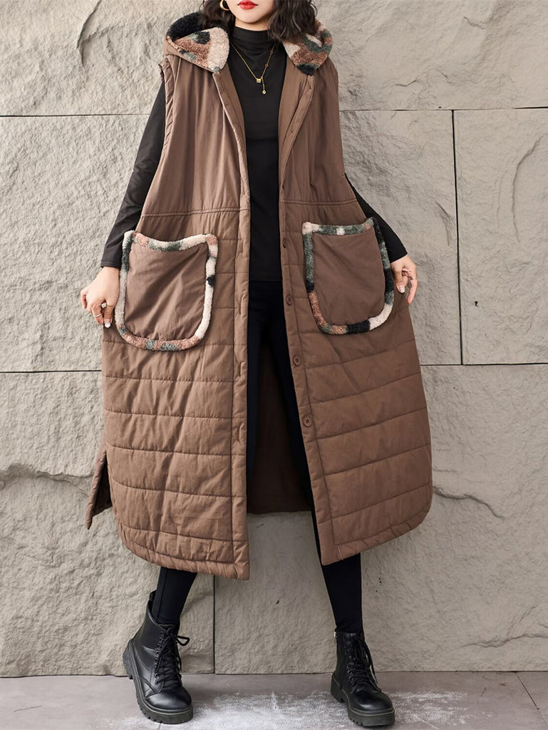 Women Winter Fleece Spliced Hooded Padded Vest Coat