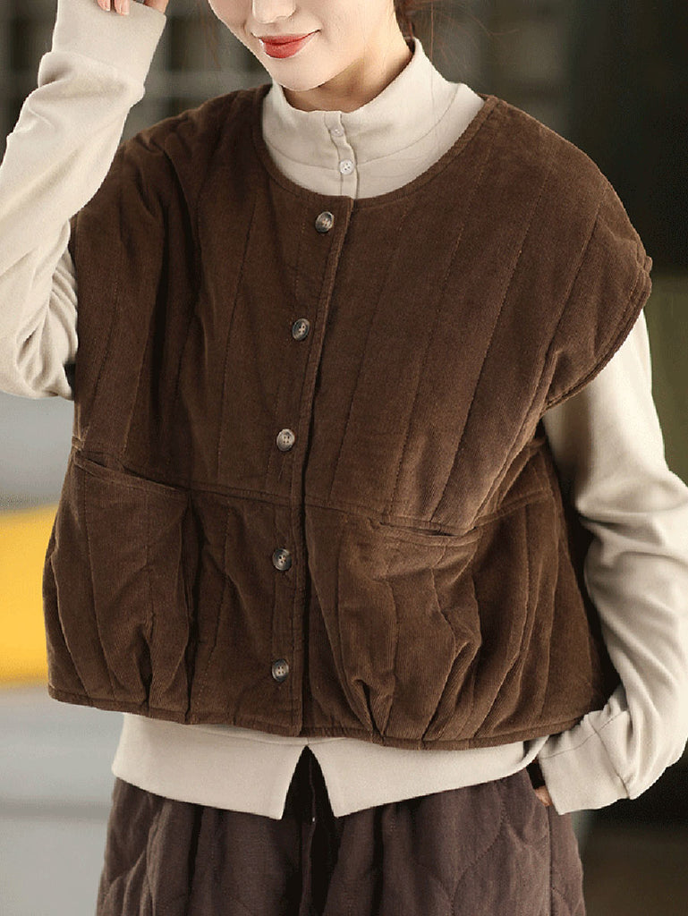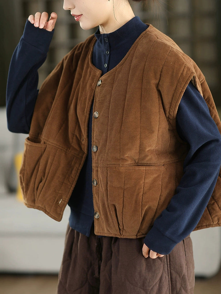 Women Winter Pure Color O-Neck Corduroy Padded Vest