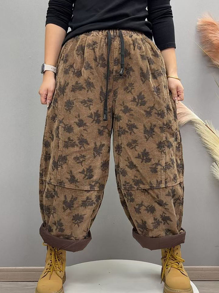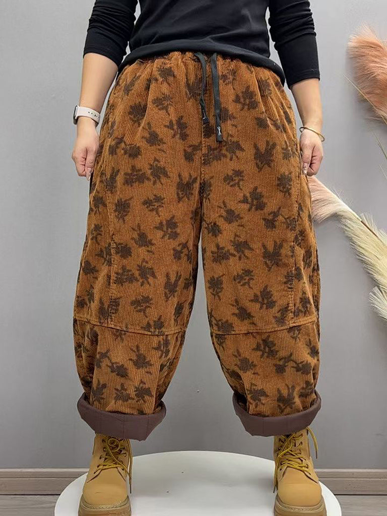 Women Winter Vintage Flower Padded Corduroy Harem Pants
