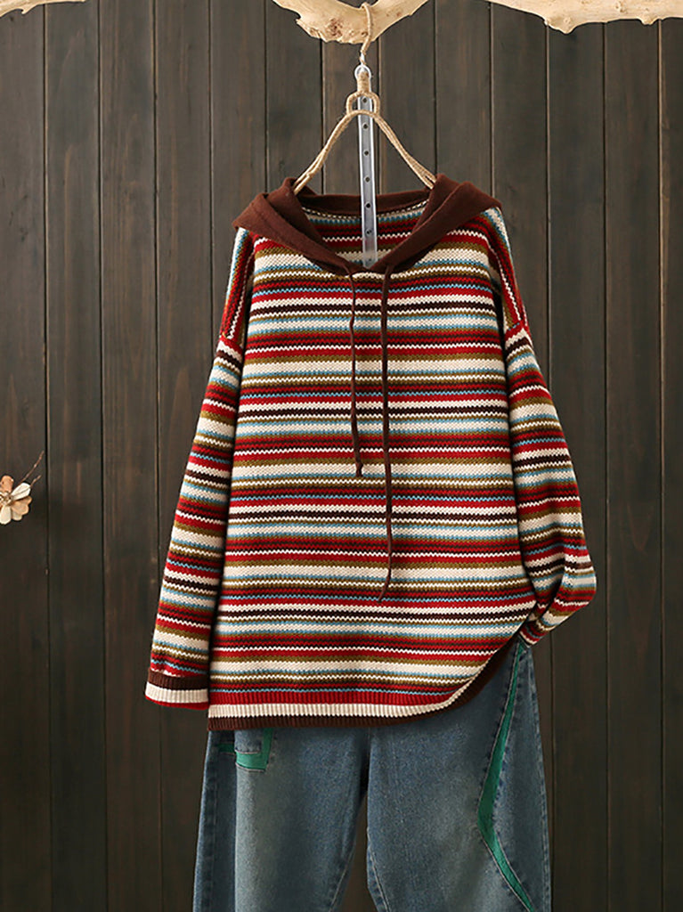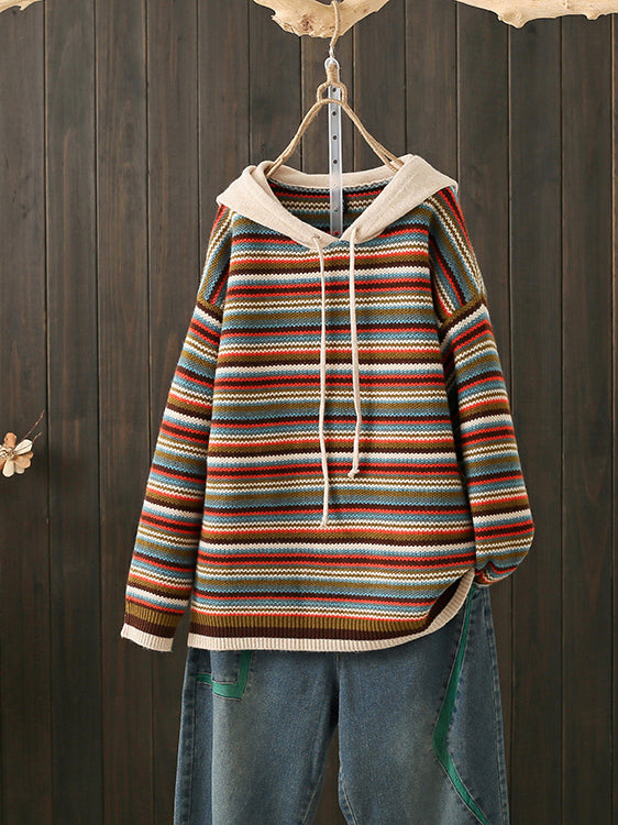 Women Autumn Casual Colorblock Stripe Hooded Sweater